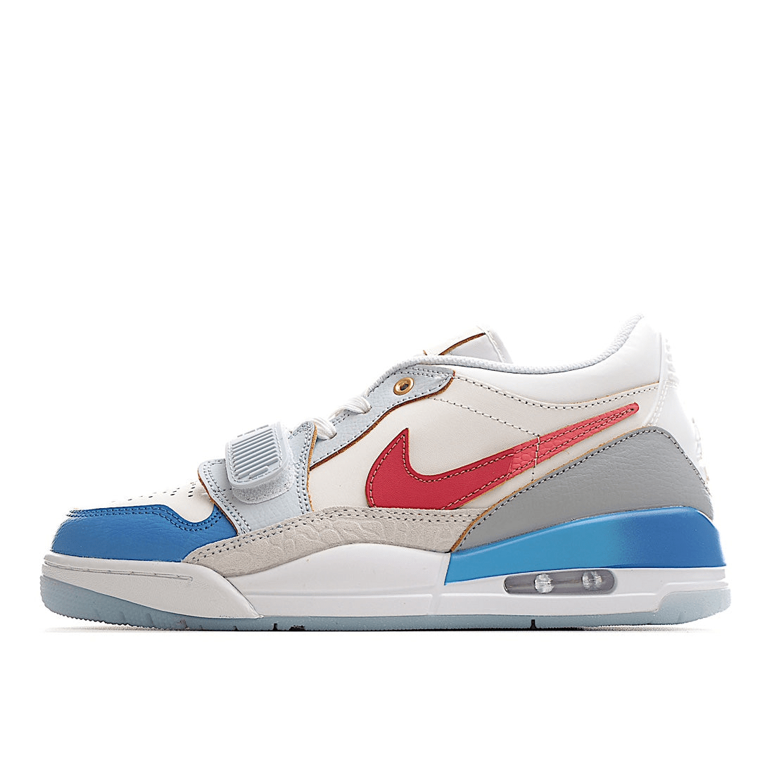 The upper is constructed from premium white leather, giving the sneaker a crisp and clean look. The signature patent leather mudguard also comes in white, creating a sleek, streamlined appearance. What makes this pair unique are the vibrant blue and red accents that bring the shoe to life. The blue highlights on the Jumpman logo and the inner lining provide a cool contrast, while the bright red detailing on the outsole and heel tab adds a pop of bold color, giving the sneaker a balanced yet eye-catching finish.