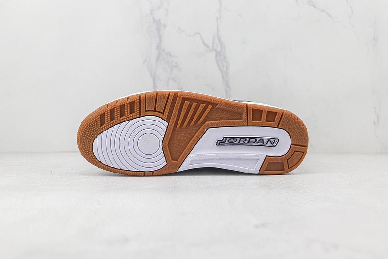 Underfoot, the Air Jordan 3 Retro Black/White/Black features a Phylon midsole paired with a visible Air-Sole unit in the heel, ensuring exceptional cushioning and comfort with every step. The rubber outsole, designed with a classic herringbone traction pattern, provides reliable grip and stability on various surfaces, making these sneakers suitable for both casual wear and athletic performance.