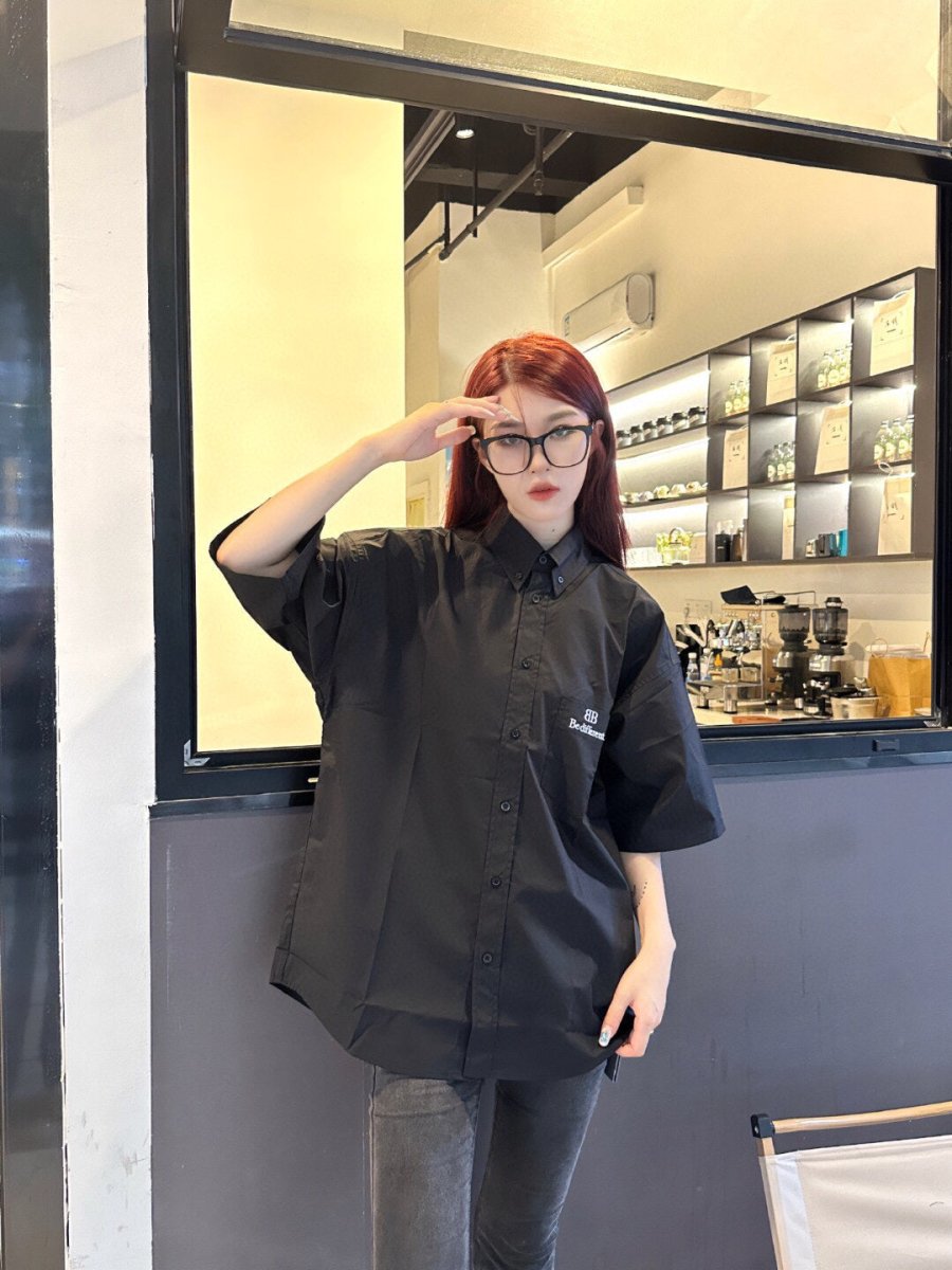 This sophisticated black shirt from Balenciaga is part of their 'Be Different' campaign, emphasizing individuality and style. It features a sleek, button-up design with a pointed collar and short sleeves, making it suitable for both casual and formal settings. The left pocket is accented with the campaign's logo, "Be different." in a subtle, contrasting print. This piece combines classic tailoring with a modern message, ideal for those who want to stand out in their fashion choices.