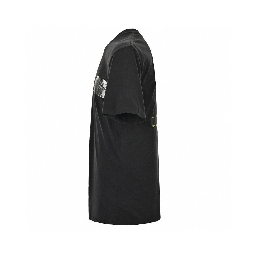 This Balenciaga t-shirt features a unique design with a small graphic patch on the chest. Made from high-quality black cotton, it offers both comfort and a modern look. Perfect for a trendy and casual style, this t-shirt is a versatile addition to any wardrobe.