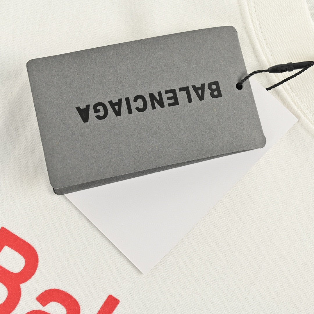 White t-shirt with a simple design. Features "Balenciaga" text in red and "The Design Team In Paris. Fn" below it. Minimalist and modern style.
