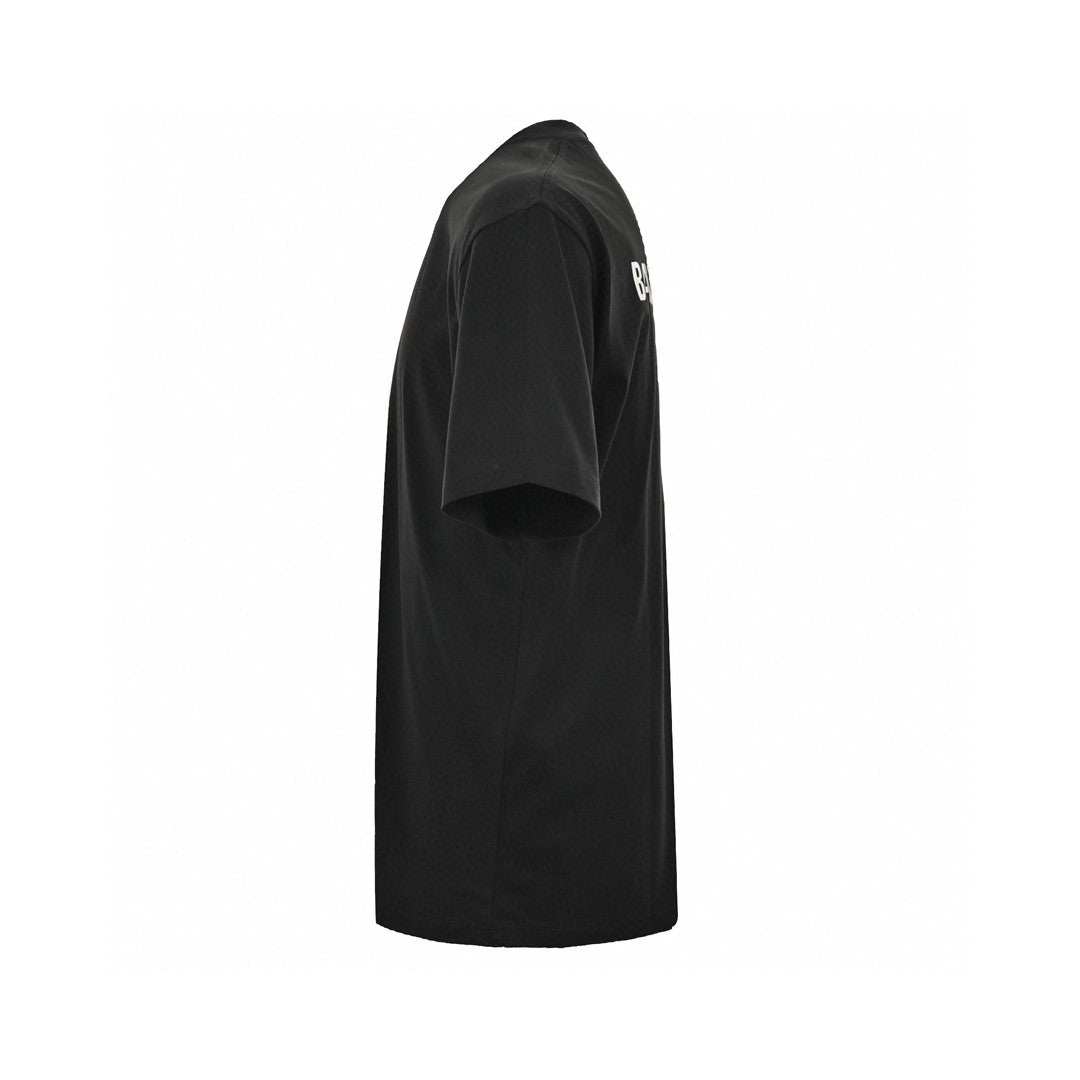 This black Balenciaga T-shirt showcases a unique distorted logo on the back, bringing a modern and unconventional twist to a classic silhouette. Crafted from high-quality cotton, it ensures exceptional comfort and longevity. The bold and distinctive logo design makes it a standout piece for those looking to add an edgy element to their casual wardrobe. Perfect for making a statement, this T-shirt effortlessly combines style with comfort.