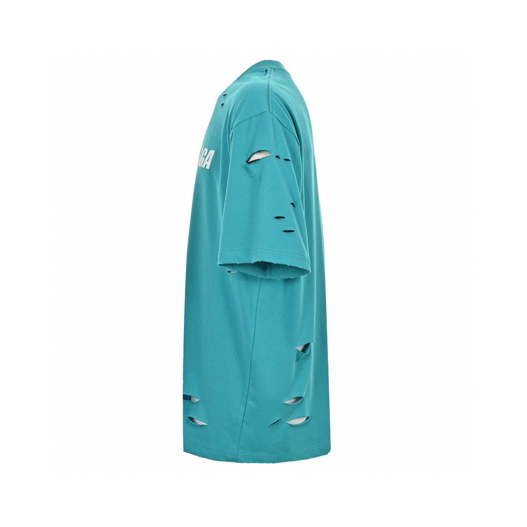 This Balenciaga t-shirt features a vibrant turquoise design with intentional distressed details, giving it a fashionable, worn-in look. The bold Balenciaga logo is prominently displayed across the chest. Made from high-quality materials, this t-shirt ensures both comfort and durability. Perfect for casual wear, it adds a stylish, edgy touch to any wardrobe.