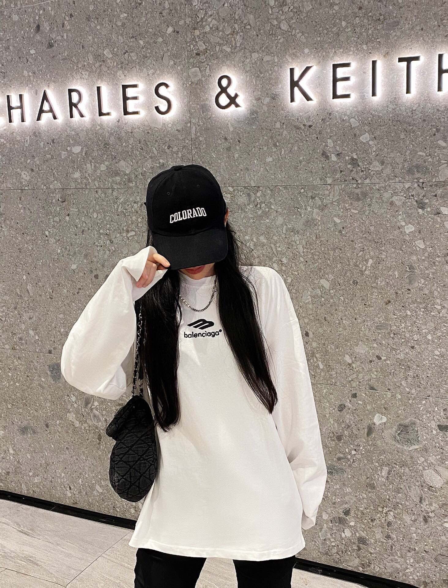 White long sleeve t-shirt with black Balenciaga logo on the chest. Simple and minimalist design. Comfortable fit, perfect for everyday wear.