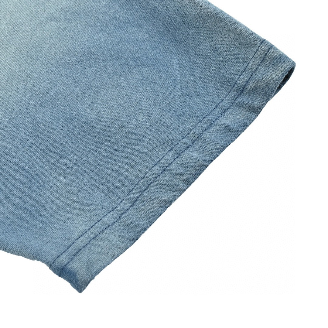 This Balenciaga t-shirt features a unique blue wash design. The front is adorned with a large, abstract Balenciaga logo in white. The faded blue fabric gives it a vintage, worn-in look. Perfect for adding a touch of bold style to casual outfits