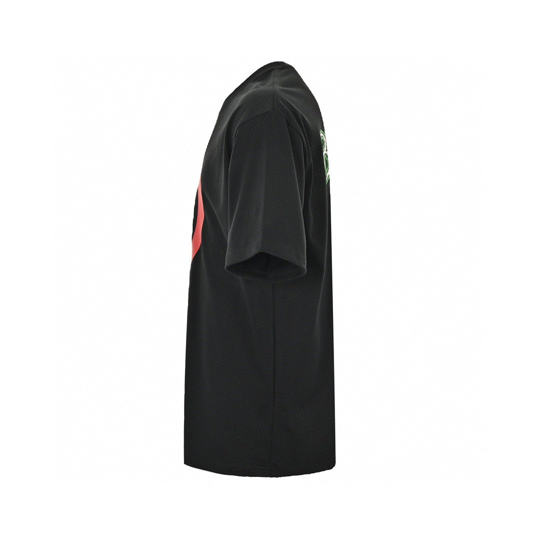 This Balenciaga t-shirt features a striking design with a large red prohibition symbol on the front. The black fabric provides a bold backdrop for the impactful graphic. Below the symbol, the Balenciaga logo is subtly placed, adding a touch of branding to the minimalist yet eye-catching design. Perfect for those who appreciate modern and edgy fashion statements.