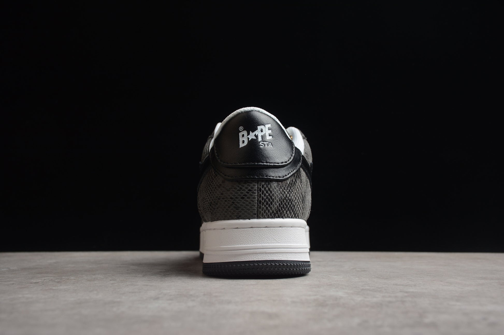 Crafted from premium materials, the upper showcases a sophisticated snakeskin pattern in black and grey tones, offering a unique texture and visual appeal. The white leather base provides a crisp, clean contrast, allowing the intricate snakeskin design to stand out. The black BAPE star logo on the sides adds a bold touch, further enhancing the overall design. Additionally, the heel features the classic BAPE branding, including the distinctive ape head logo.