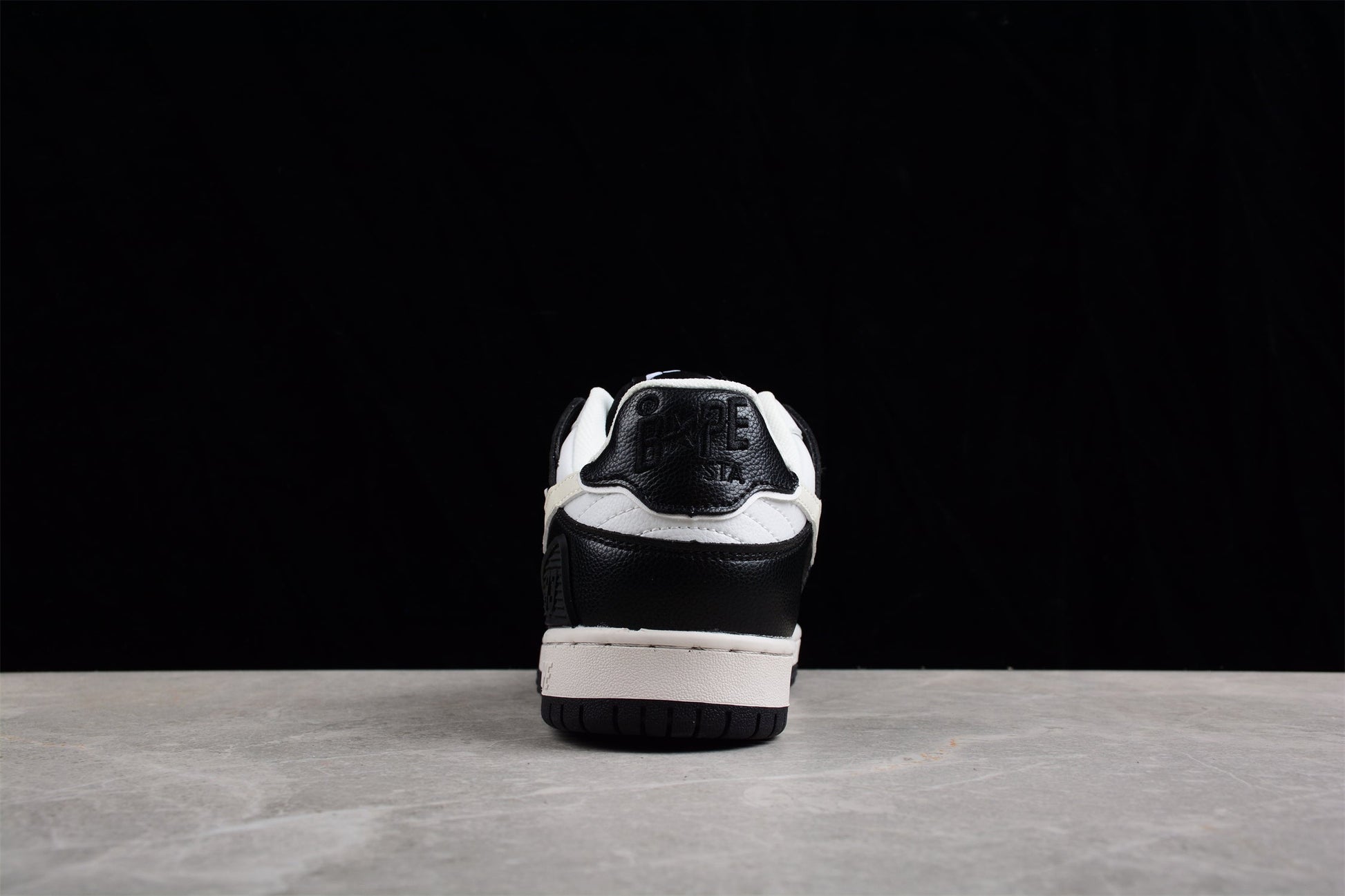 The thick rubber sole, in a complementary black and white colorway, ensures excellent traction and durability. The sole features subtle BAPE branding, reinforcing the sneaker's unique appeal and connection to streetwear culture. The attention to detail in the design and construction of these sneakers makes them a must-have for any sneaker enthusiast.