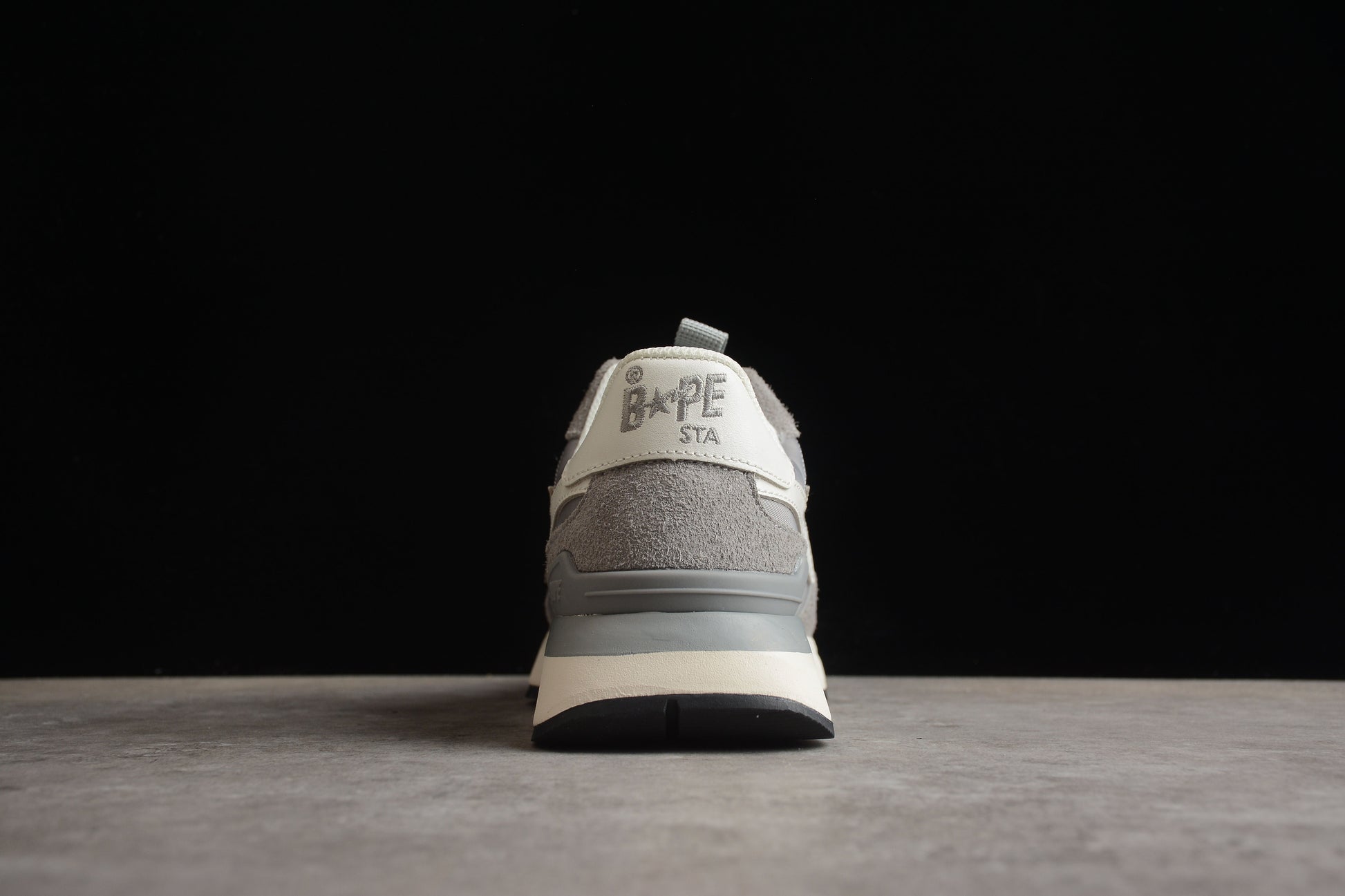 Crafted from premium materials, the upper features a combination of grey mesh and suede overlays, providing both durability and breathability. The subtle contrast between the different textures adds depth to the design, while the white BAPE star logo on the sides offers a striking yet understated look. The neutral grey and white colorway ensures these sneakers can easily complement a variety of outfits.
