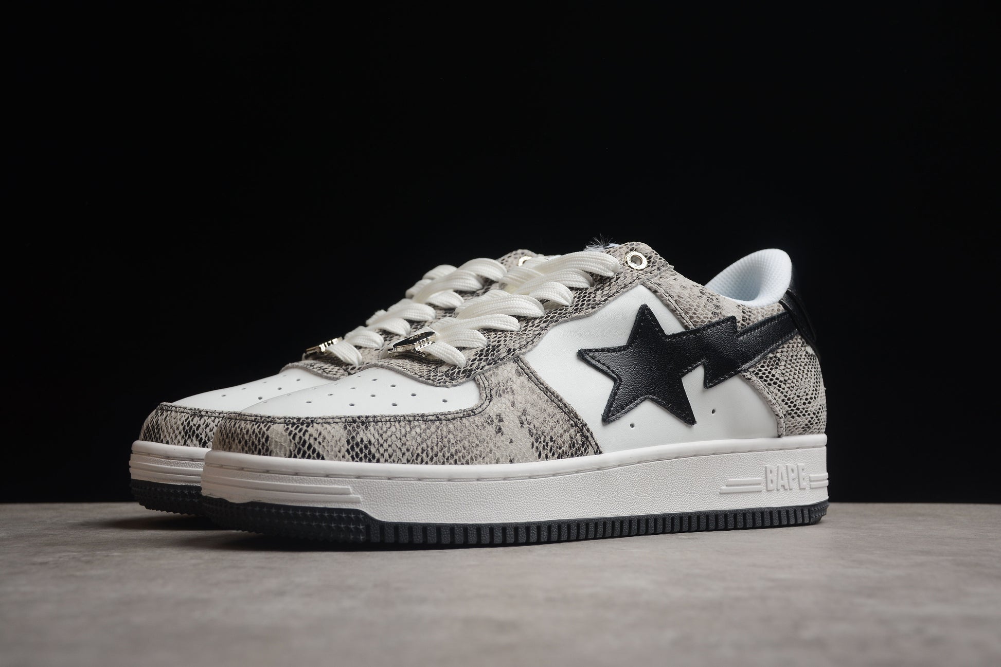 Crafted from premium materials, the upper features a striking snakeskin pattern that adds a touch of wild sophistication. The white leather base provides a clean backdrop, allowing the intricate snakeskin design to take center stage. The black BAPE star logo on the sides offers a bold contrast, enhancing the overall aesthetic. The sneaker also features the iconic BAPE branding, including the distinctive ape head logo on the heel.