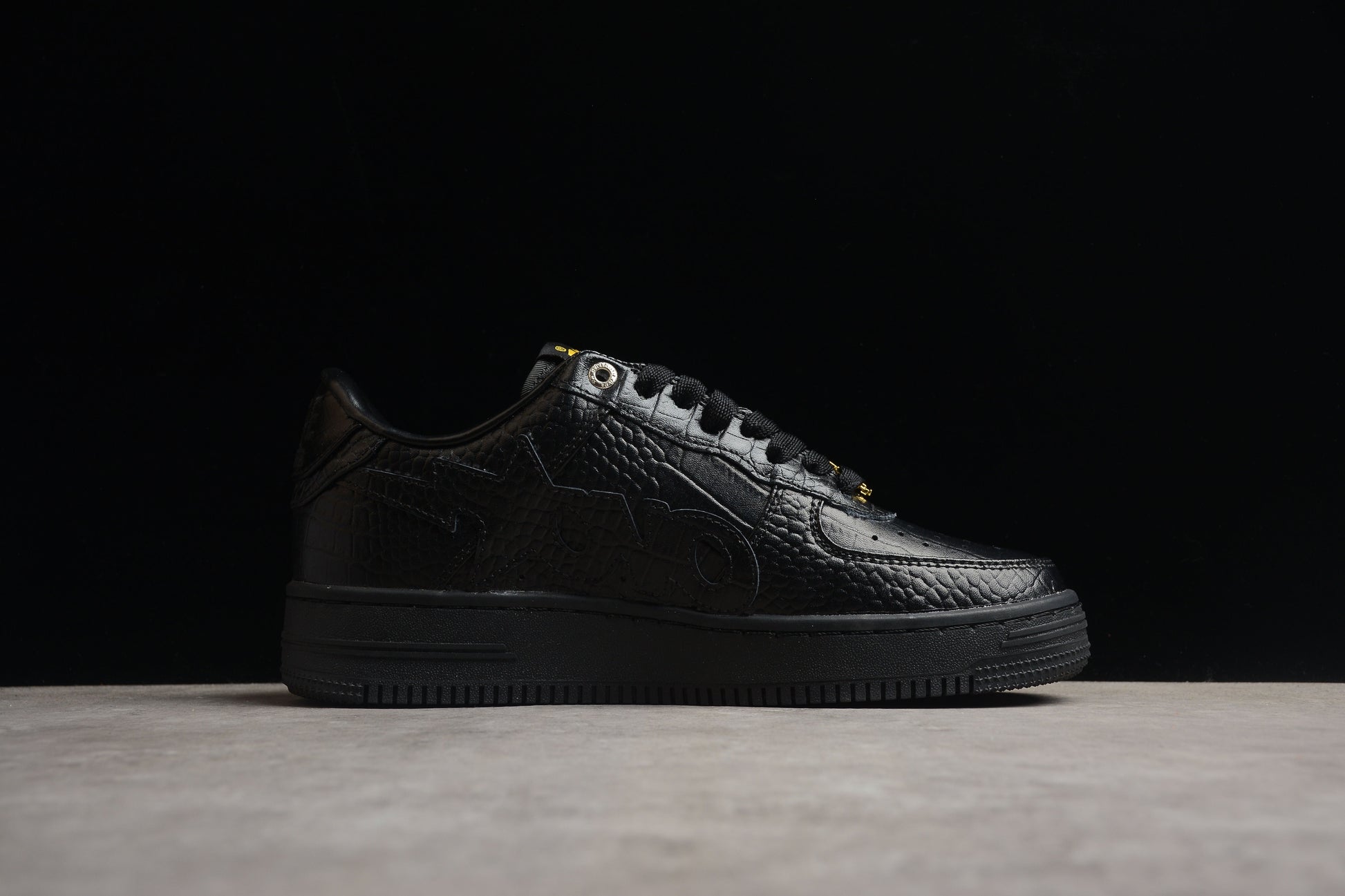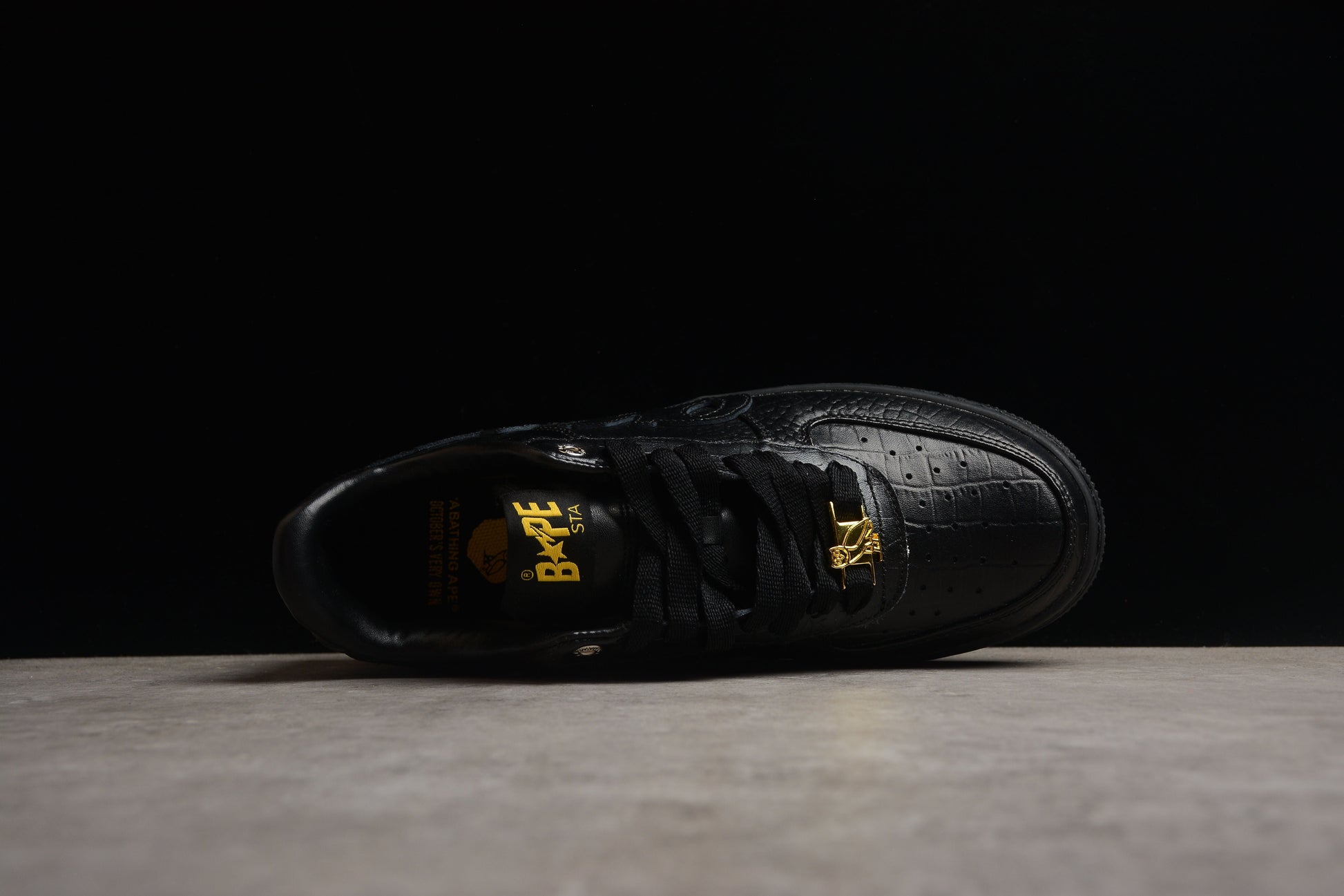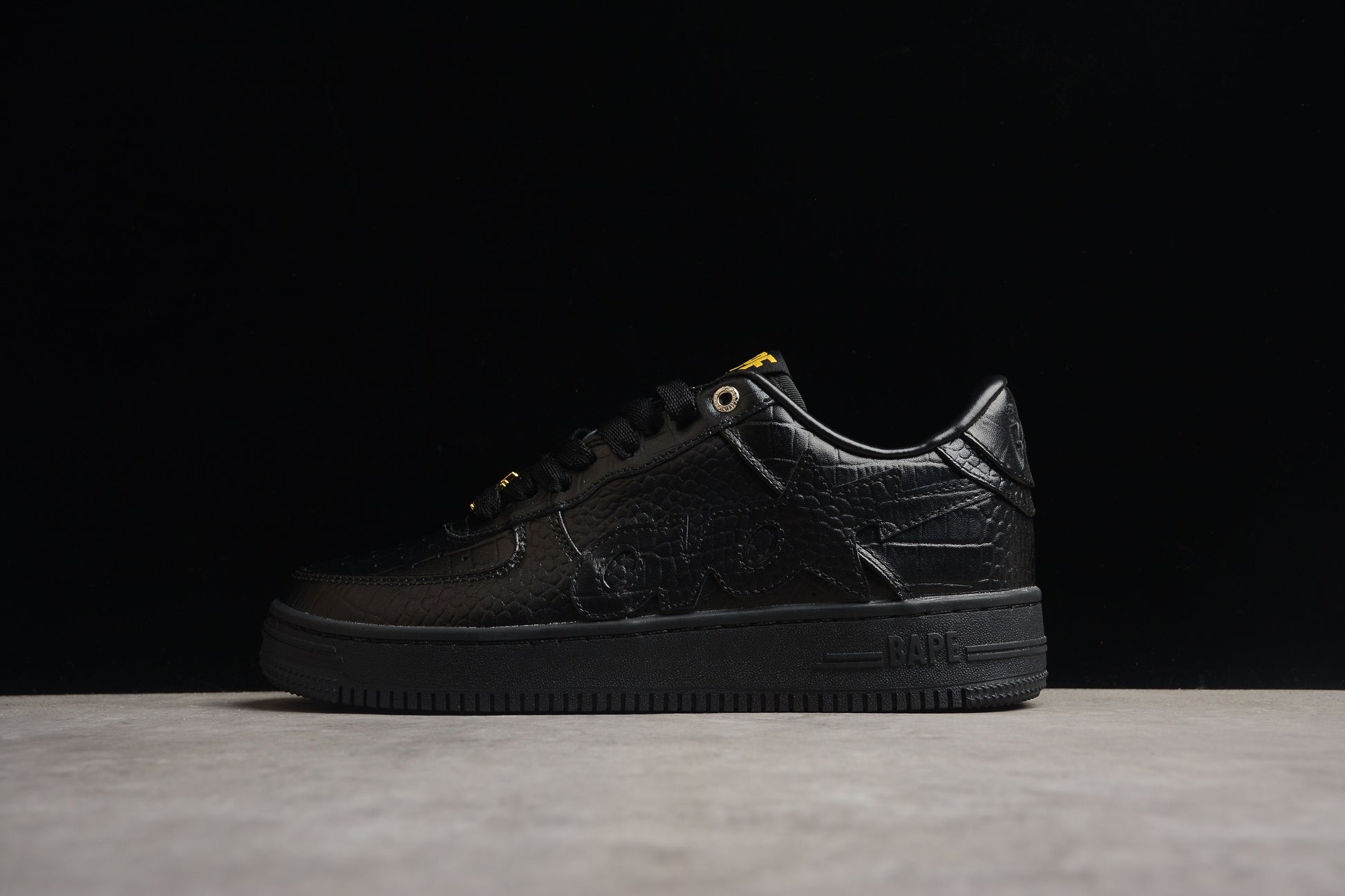 These sneakers feature a sleek black leather upper with a distinctive crocodile-embossed texture, providing a premium and edgy look. The iconic BAPE STA star logo is subtly integrated into the side panels, enhancing the overall design without overpowering it. The black colorway is complemented by gold accents on the lace eyelets and tongue, adding a touch of luxury and contrast.