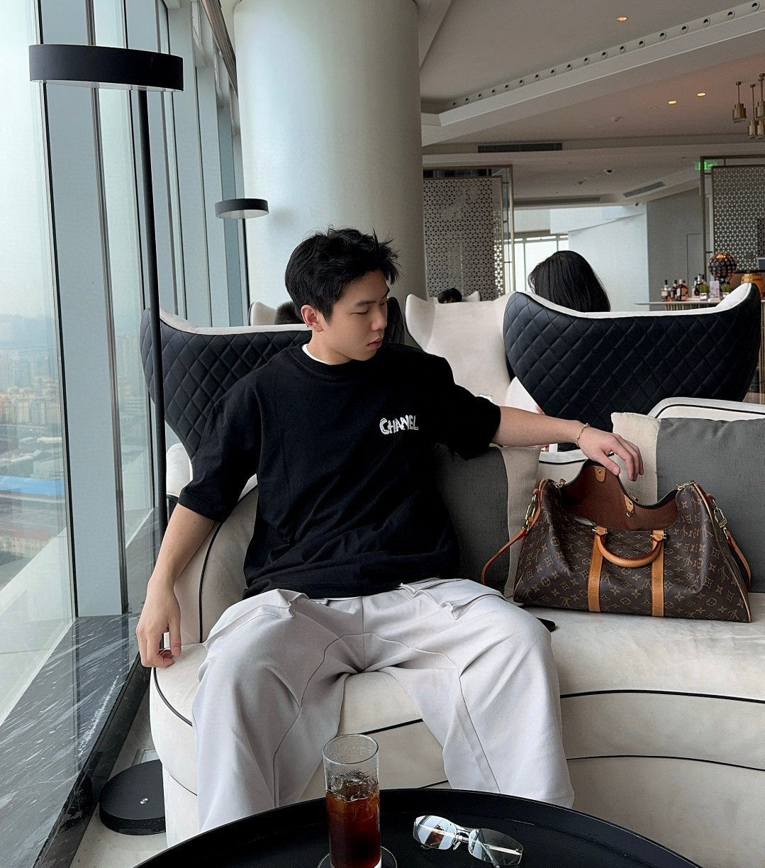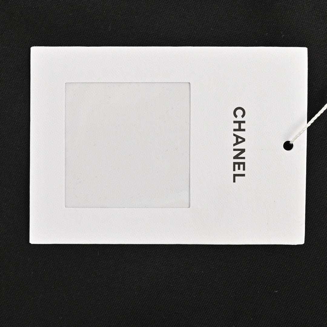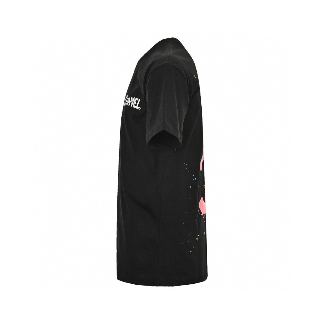 This Chanel t-shirt features a large pink logo with a splash paint effect, complemented by the brand name in bold lettering. The vibrant and artistic design, set against a black background, makes it a standout piece for any fashion-forward wardrobe.
