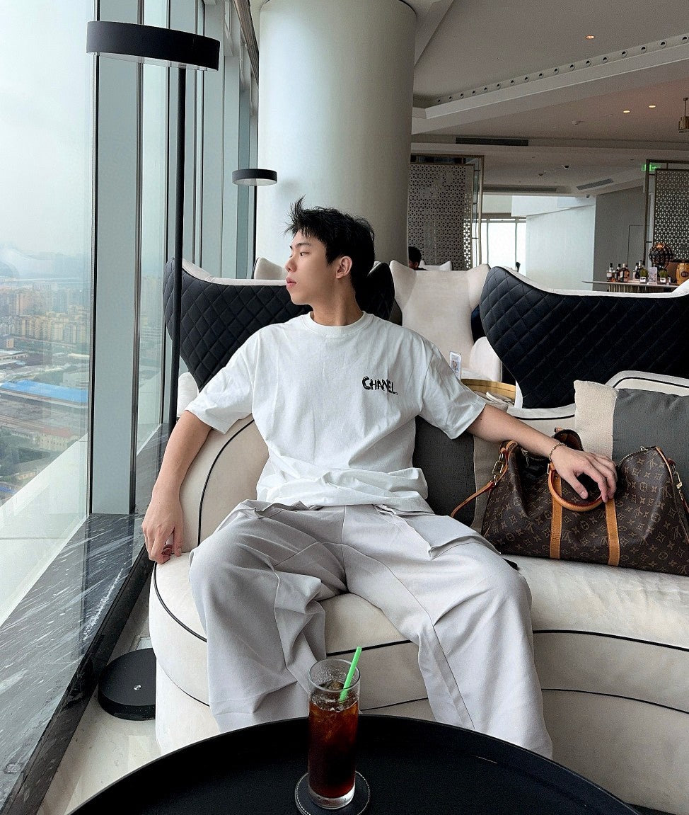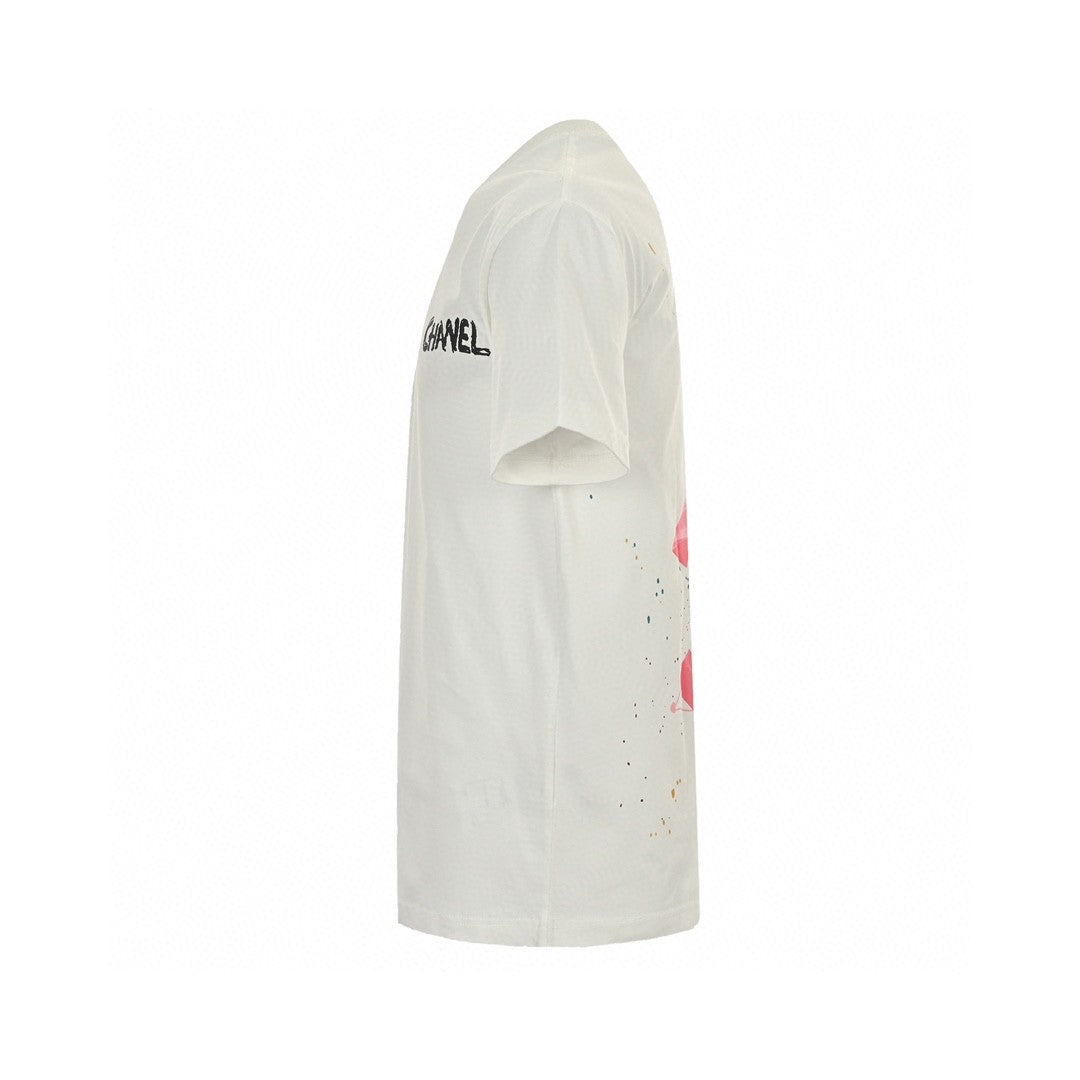 This Chanel t-shirt features a large pink logo with a splash paint effect, complemented by the brand name in bold lettering. The vibrant and artistic design, set against a white background, makes it a standout piece for any fashion-forward wardrobe.