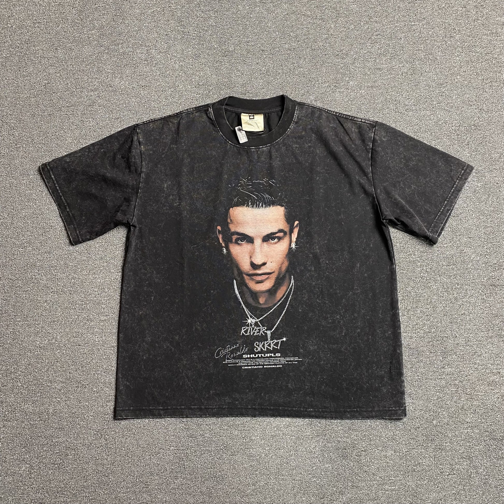 Featuring a faded, distressed graphic of CR7, the washed dark grey colorway gives it an authentic vintage look, reminiscent of classic sports tees. Designed with a relaxed fit, it pairs effortlessly with cargos, denim, or layered under a jacket, making it a versatile addition to any streetwear wardrobe.
