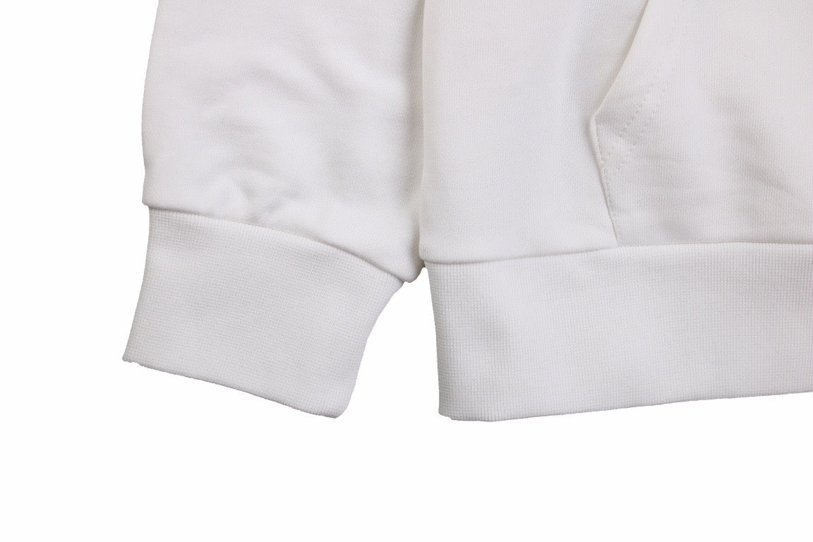 This Dior hoodie in white features a bold brushstroke-style "DIOR" logo on the front. It combines a casual aesthetic with an artistic flair, perfect for making a statement. Includes a drawstring hood and a kangaroo pocket for comfort and practicality.