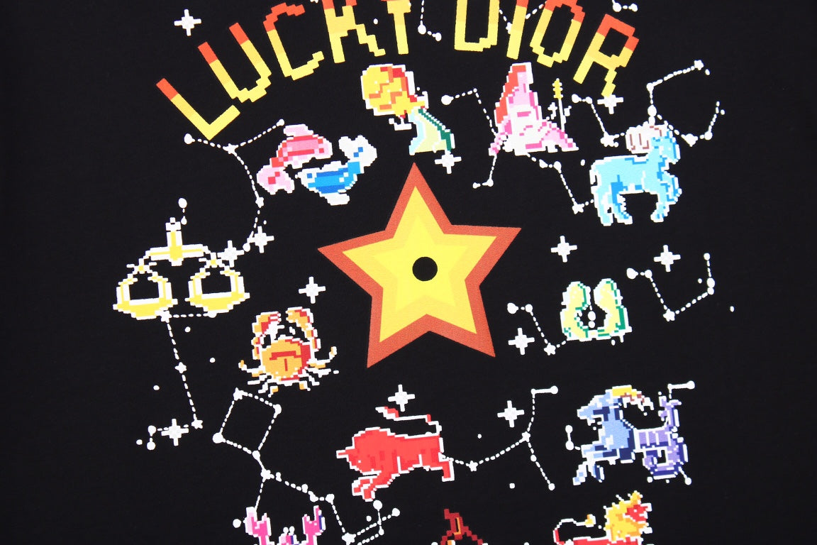 Black t-shirt featuring a distinctive "DIOR" logo in a gradient color scheme on the chest. Made from high-quality fabric for a comfortable and stylish fit. Perfect for adding a subtle pop of color to any casual outfit.
