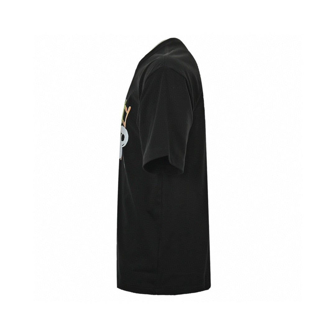 This Dior t-shirt features a playful green monster graphic intertwined with the brand name in bold lettering. The whimsical design, set against a sleek black background, adds a fun and unique touch to any wardrobe.
