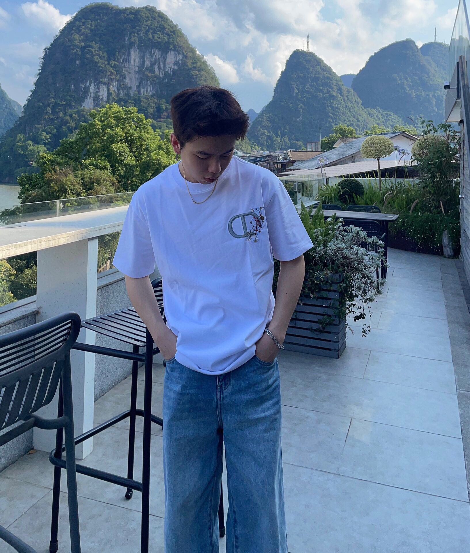 This Dior t-shirt features a floral CD logo design. It is white with colorful floral detailing. Perfect for an elegant and modern look.