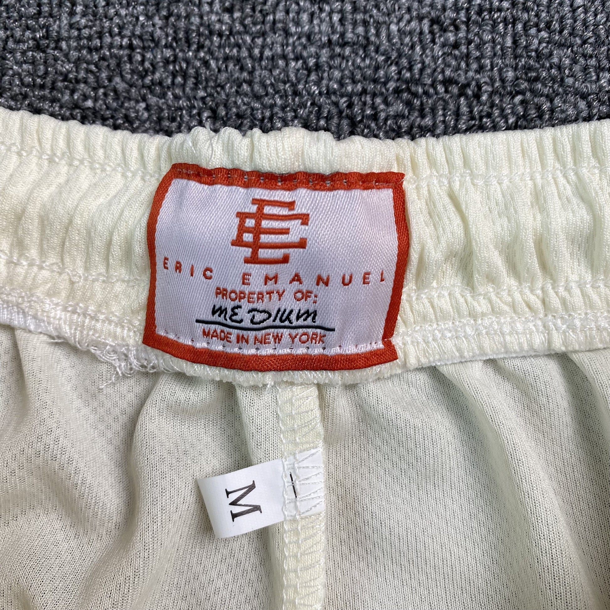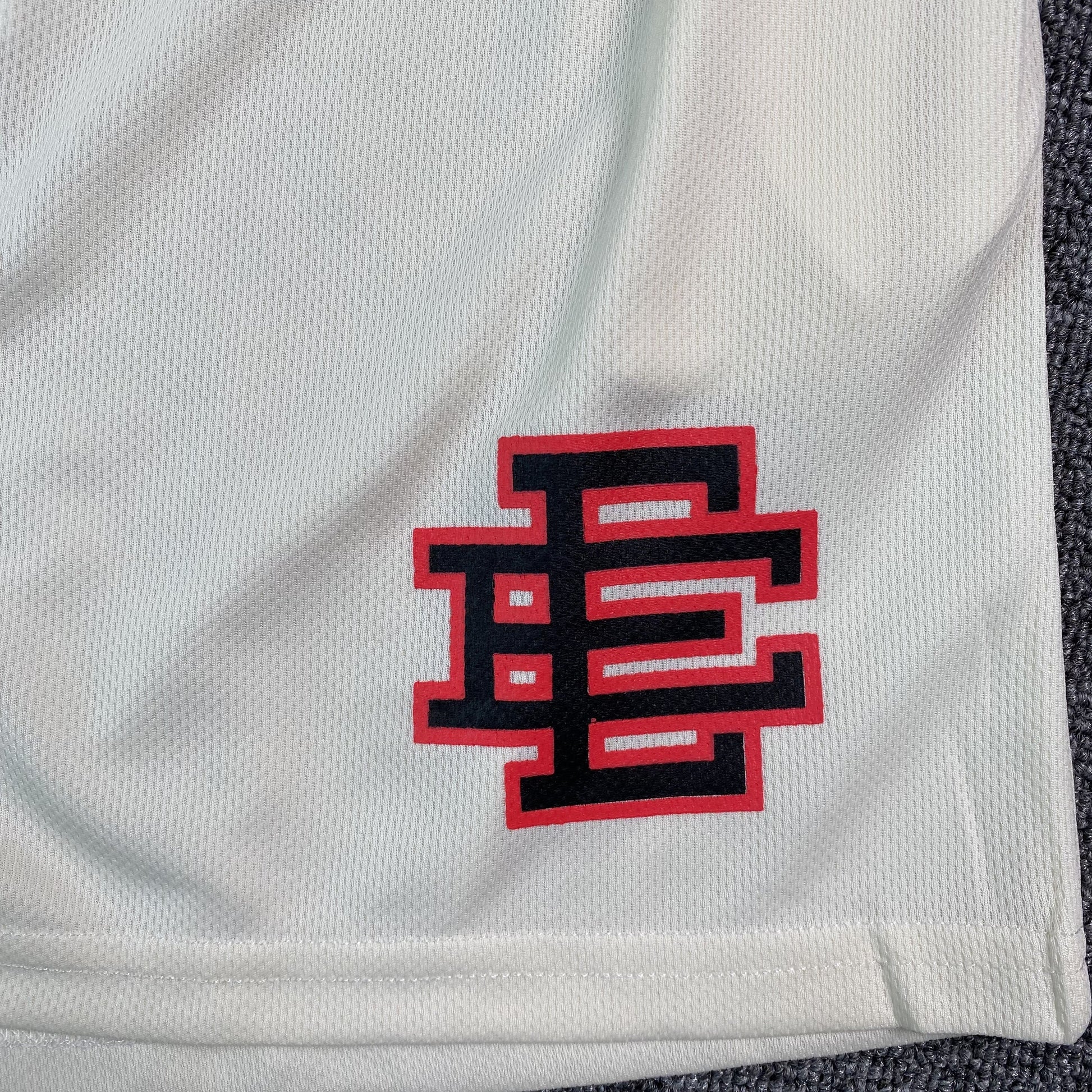 Featuring a clean cream base with striking black and red accents, these shorts showcase the iconic EE logo, giving them a signature streetwear appeal. The elastic waistband with an adjustable drawstring ensures a secure, customized fit, making them ideal for lounging, basketball, or effortlessly elevating your streetwear look.