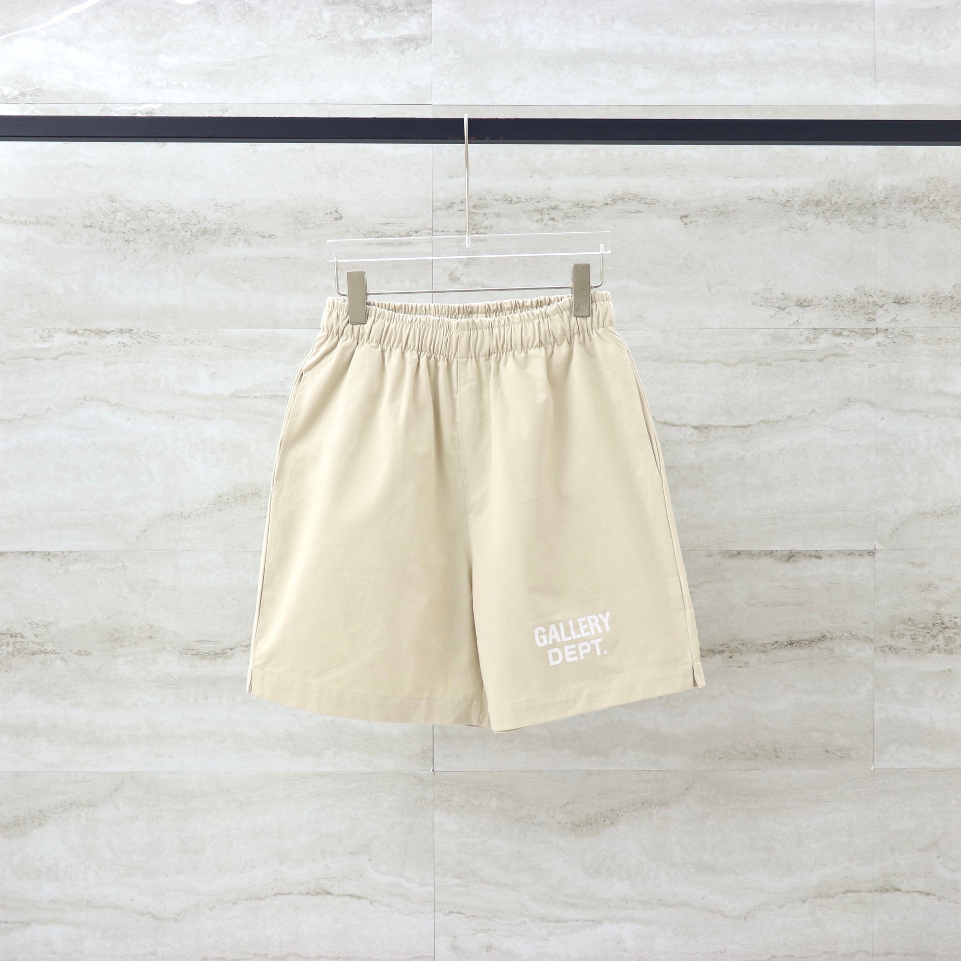 The shorts feature a clean, minimalist design with the iconic Gallery Dept. logo printed on the lower left leg in a crisp, white font. This subtle yet distinctive branding adds a touch of sophistication to the overall look, ensuring you stand out in a refined manner.