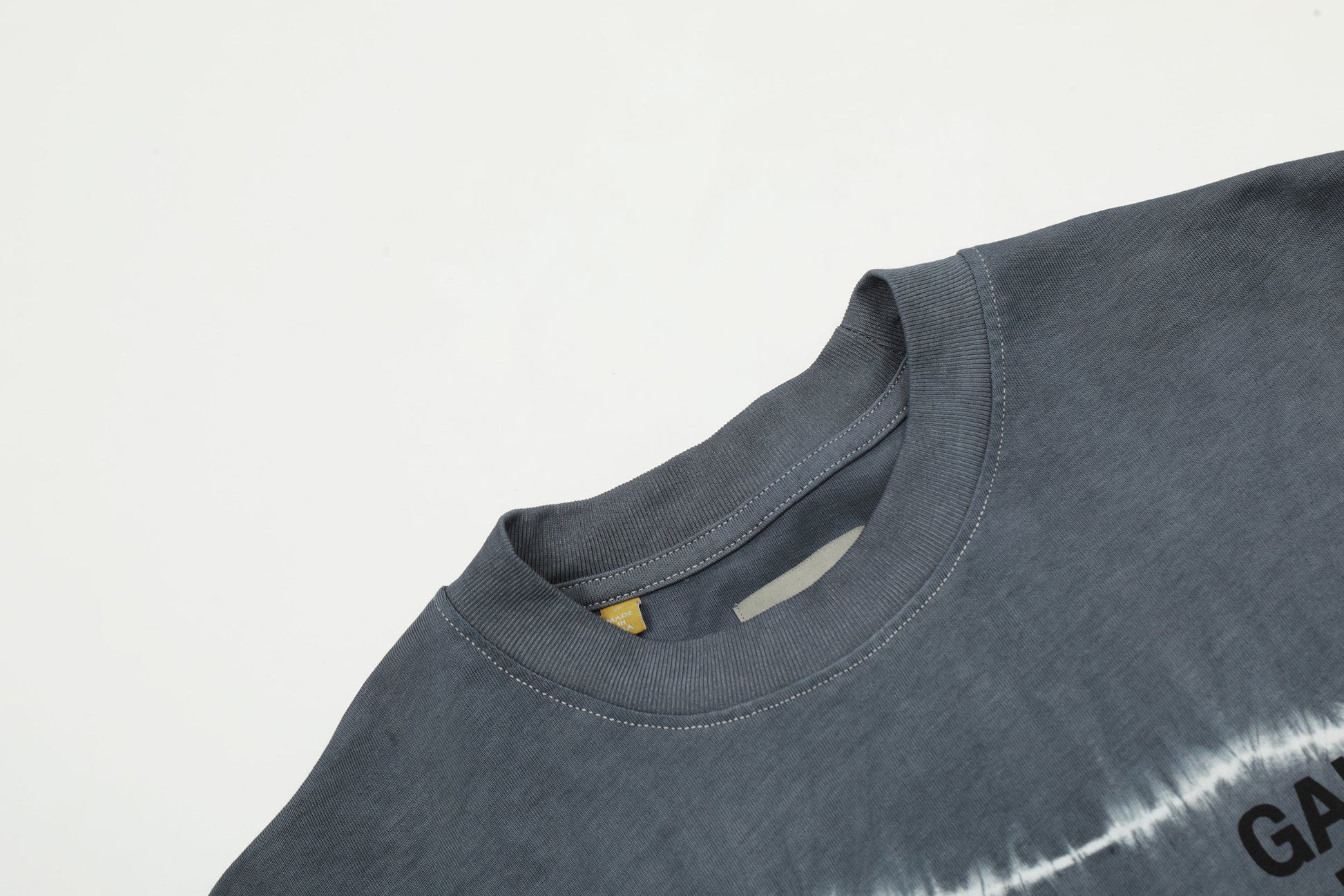 The striking tie-dye design in shades of blue and white creates a visually appealing and unique look, ensuring no two pieces are exactly alike. The back of the tee prominently showcases the "GALLERY DEPT. HOLLYWOOD, CA" text in bold black lettering, giving a nod to the brand's creative roots and artistic heritage. This graphic detail enhances the overall aesthetic and makes a strong style statement.