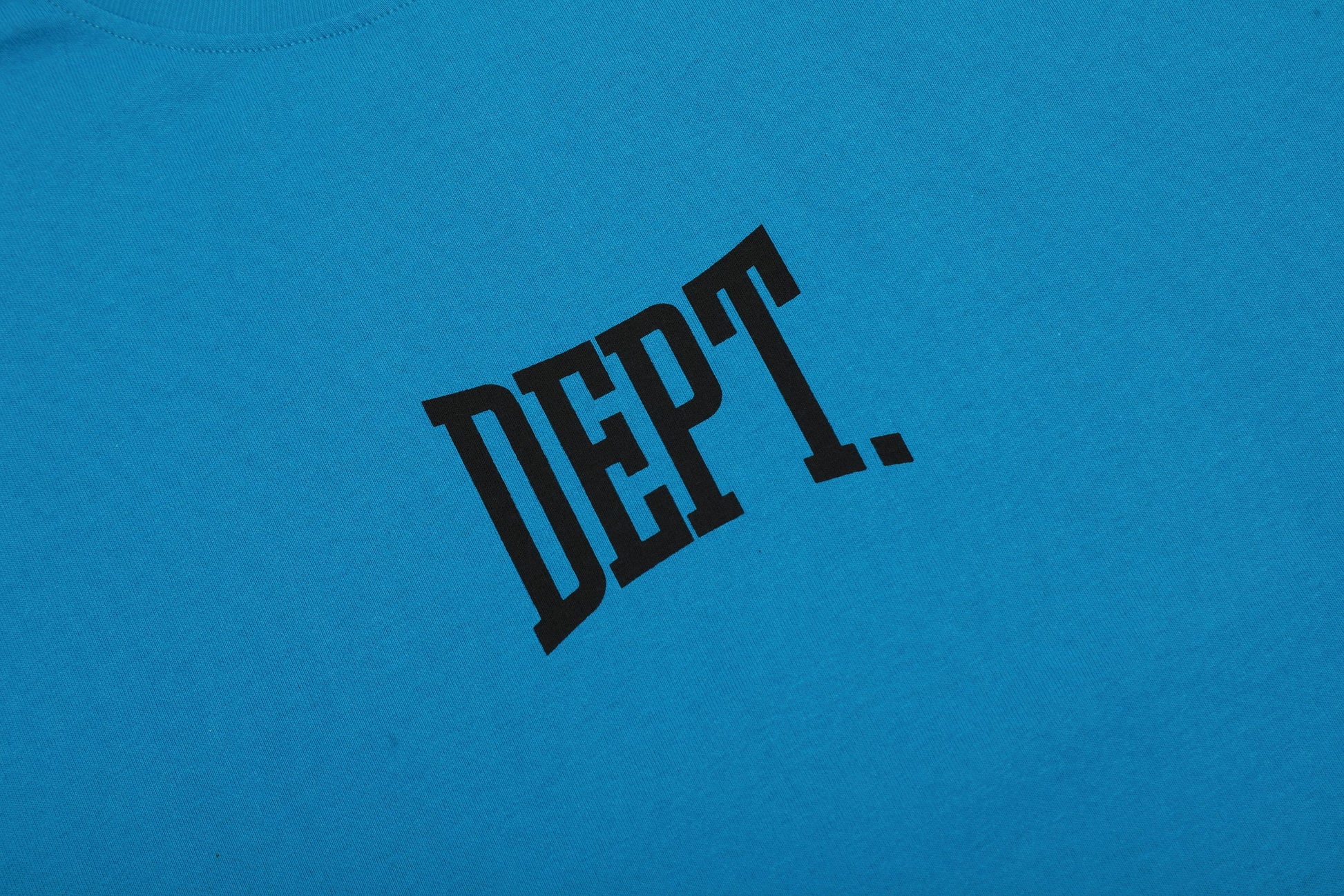 Introducing the Gallery Dept. "DEPT." T-Shirt in a vibrant blue hue, a perfect blend of simplicity and boldness. This T-shirt is crafted from high-quality cotton, ensuring a soft and comfortable fit that's perfect for everyday wear. The standout feature of this piece is the "DEPT." graphic in black, centrally positioned on the chest, creating a striking contrast against the vivid blue fabric.