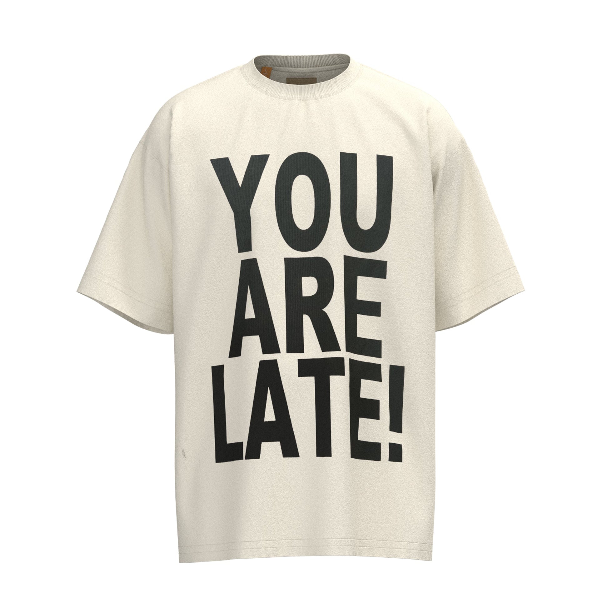Make a bold statement with the Gallery Dept. "You Are Late!" T-Shirt. This eye-catching piece is perfect for those who want to stand out and express their unique sense of style. The front of the shirt features the striking text "YOU ARE LATE!" in large, black, block letters, ensuring that your message is clear and impactful.