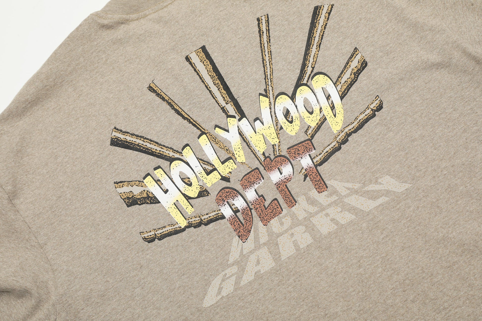 The standout feature of this tee is the eye-catching graphic on the back. The bold "HOLLYWOOD DEPT" text is prominently displayed, surrounded by a dynamic sunburst design. This vibrant graphic not only captures attention but also reflects the energetic and artistic spirit of Hollywood. The distressed effect on the print adds a vintage touch, enhancing the tee's overall aesthetic.