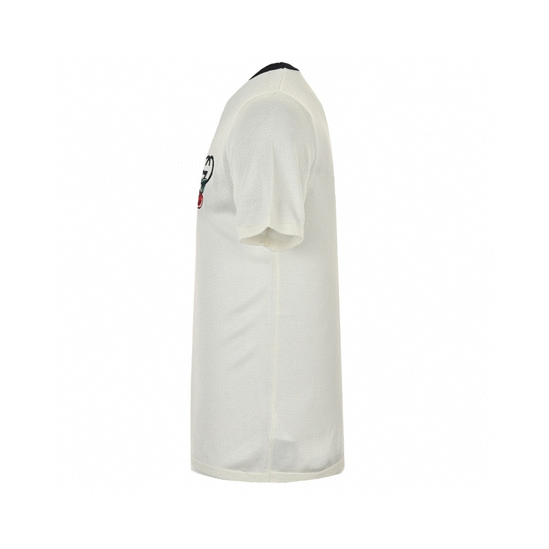 The Gucci Cherry Embroidered T-Shirt offers a playful twist on luxury fashion. This white tee is accented with a black collar, creating a sleek and modern contrast. The chest features an embroidered cherry motif intertwined with the iconic Gucci logo, adding a fun and unique element to the classic silhouette. Crafted from premium cotton, this t-shirt ensures a soft and comfortable fit. Ideal for casual wear, it pairs perfectly with jeans, shorts, or layered under a jacket for a stylish, relaxed look. Elevate your everyday wardrobe with this distinctive piece from Gucci.
