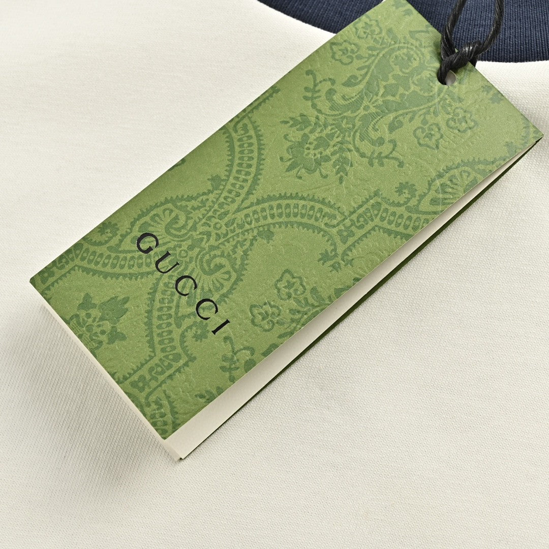 This Gucci t-shirt features a small, playful cherry graphic intertwined with the iconic Gucci logo on the chest. The design is set against a white background with a contrasting black collar, adding a touch of fun and elegance to your casual wardrobe.