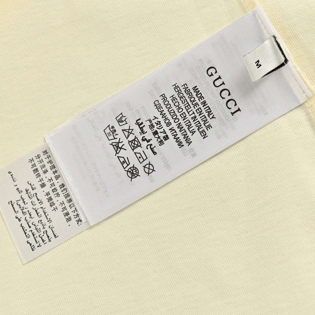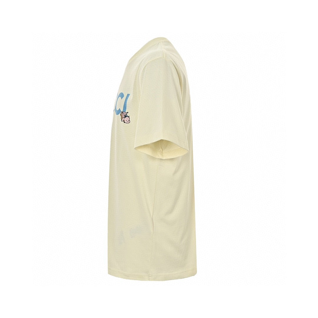 This Gucci t-shirt features a playful graphic design with the Gucci logo and small cherubs scattered around it. The cream-colored cotton fabric serves as a perfect backdrop for the vibrant blue logo and colorful cherubs, making this t-shirt a fun and stylish addition to any wardrobe. The combination of luxury and whimsy creates a standout piece for casual and fashionable looks.