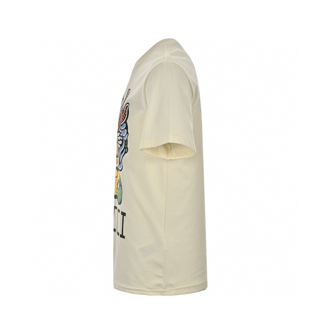 This Gucci t-shirt features a vibrant dragon graphic on the front. The colorful design includes various hues of green, blue, and red, creating a bold and striking look. The shirt is cream-colored with the iconic Gucci logo displayed prominently. Perfect for making a statement.