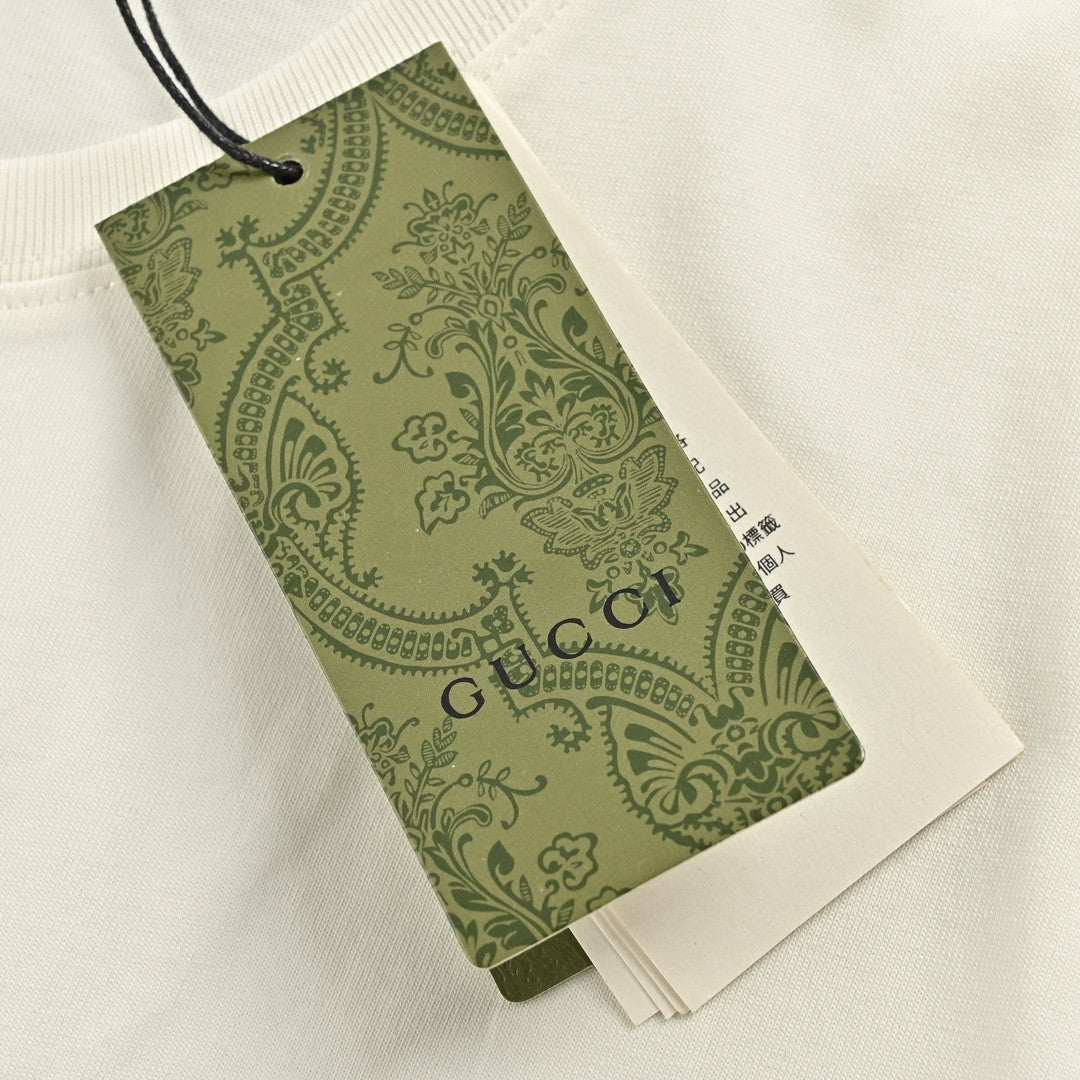 This Gucci t-shirt features a playful graphic design with eyes on a green and pink stripe, accompanied by the Gucci logo. The cream-colored cotton fabric provides a perfect backdrop for the vibrant artwork, making this t-shirt a fun and stylish addition to any wardrobe. The blend of luxury and whimsy makes it a standout piece for casual and fashionable looks.