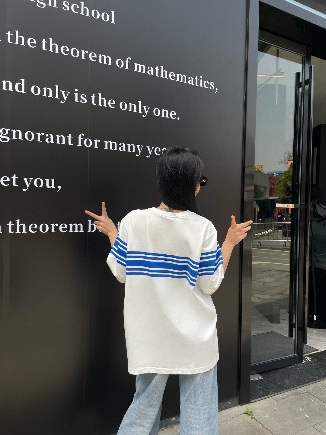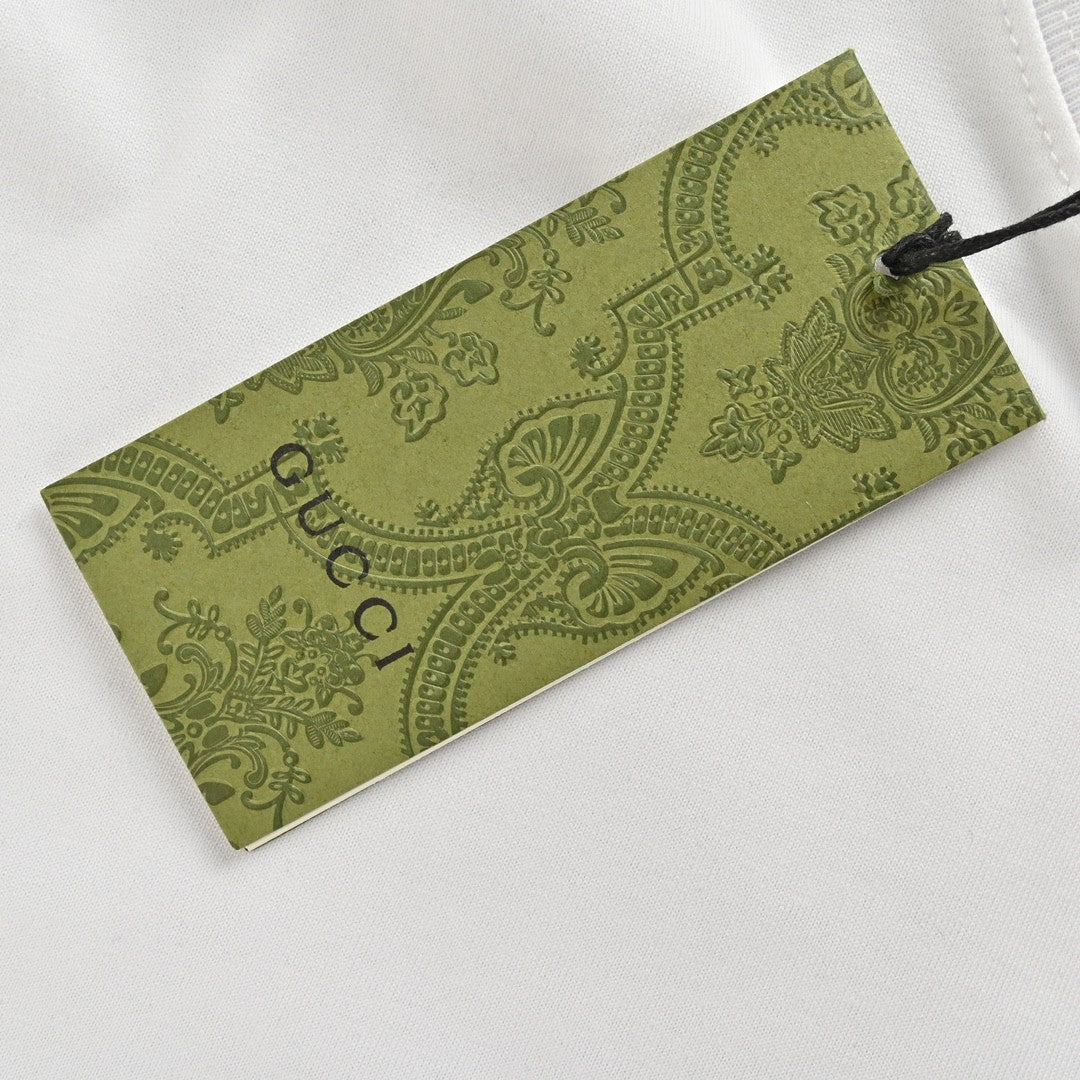 This Gucci t-shirt features a stylish blue stripe design across the chest and sleeves, accented with the iconic "GG" logo. The shirt is primarily white, offering a relaxed fit with short sleeves and a high neck. Perfect for adding a touch of luxury to your casual wardrobe while staying comfortable.