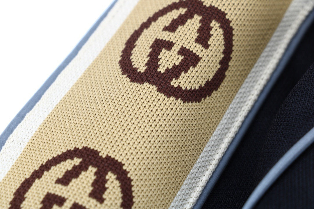 This Gucci track jacket showcases a classic black design with bold beige GG logo stripes along the sleeves. It features a high collar and zip closure, blending luxury fashion with athletic style. The jacket's comfortable fit and iconic branding make it a versatile choice for casual wear.
