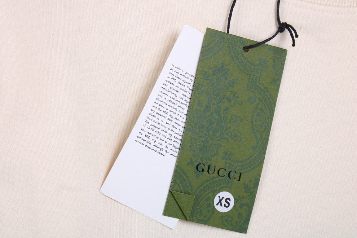 This cream-colored Gucci sweatshirt showcases the iconic interlocking G logo in a striking blue and green design on the chest. Crafted from high-quality materials, it offers both comfort and style, making it a versatile addition to any wardrobe.