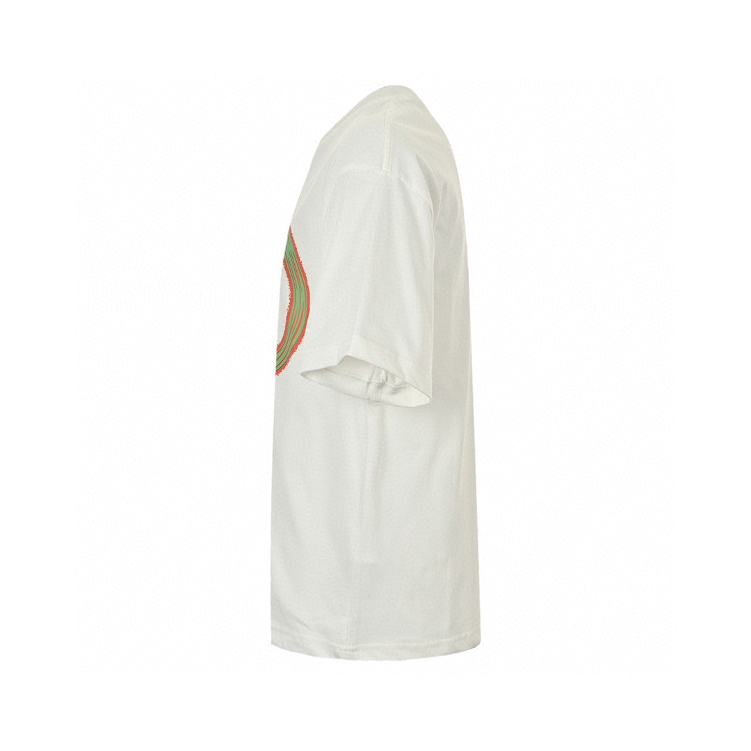 This Gucci t-shirt features a large, multicolor interlocking G logo on the front. The vibrant design adds a bold and contemporary touch to the classic white background, making it a standout piece for any fashion-forward wardrobe.