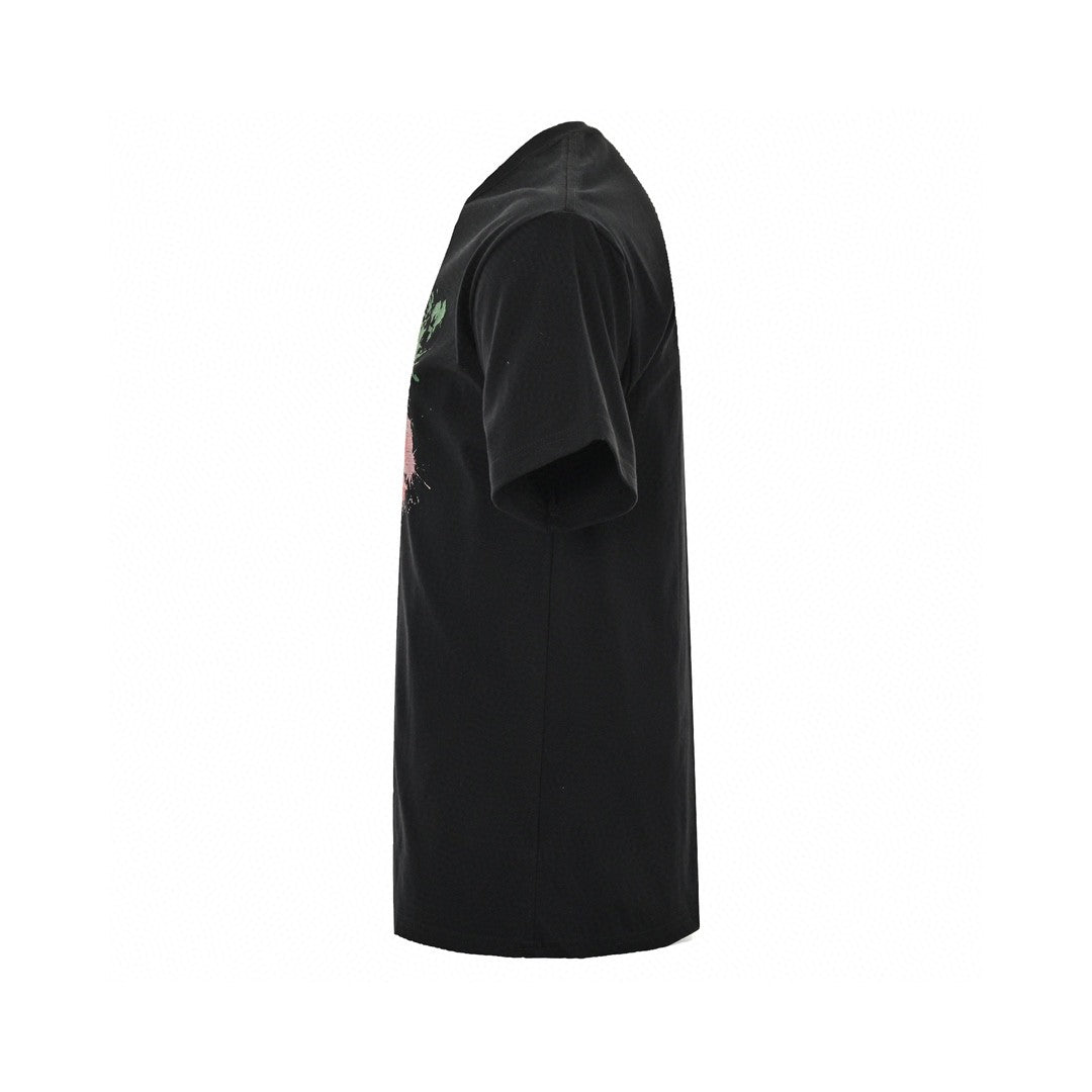 This black Gucci T-shirt features a vibrant splatter logo design. The iconic Gucci double G logo is prominently displayed in the center, overlaid with dynamic green and red paint splatter effects, giving it a modern and artistic flair. Crafted from high-quality materials, this T-shirt offers both comfort and style. Its relaxed fit and classic crew neckline make it a versatile addition to your wardrobe, perfect for adding a touch of designer elegance to your casual look.