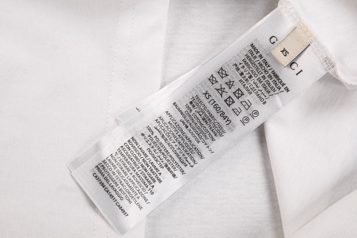 White t-shirt featuring a bold Gucci logo in a retro font with pink and yellow gradient. Eye-catching design perfect for a stylish, casual look. Comfortable for everyday wear.