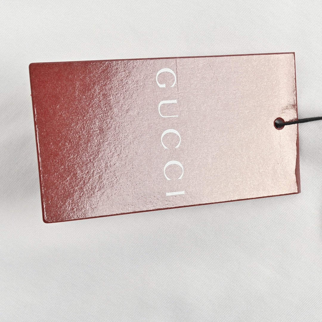 The Gucci White T-Shirt with Blue Vertical Logo Patch is a perfect blend of classic style and modern design. Made from premium cotton, this t-shirt offers a soft and breathable fit, ideal for everyday wear. The design features a small, vertical Gucci logo patch in blue on the chest, adding a subtle yet eye-catching branding element to the clean white fabric. This minimalist yet stylish design allows for easy pairing with various outfits, whether casual or slightly dressier. Perfect for those who appreciate understated elegance, this Gucci t-shirt is a versatile addition to any wardrobe, providing both comfort and style for any occasion.