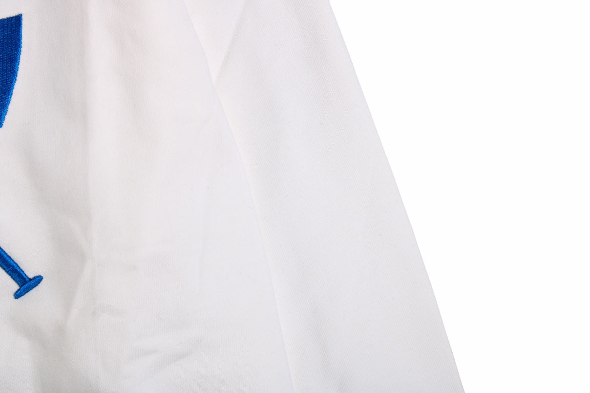 This Gucci x Adidas hoodie is crafted in white fabric, featuring the iconic blue Adidas trefoil logo with Gucci branding on the front. It includes a drawstring hood and a kangaroo pocket, offering a blend of style and functionality. The ribbed cuffs and hem ensure a comfortable fit, making it a perfect choice for casual wear.