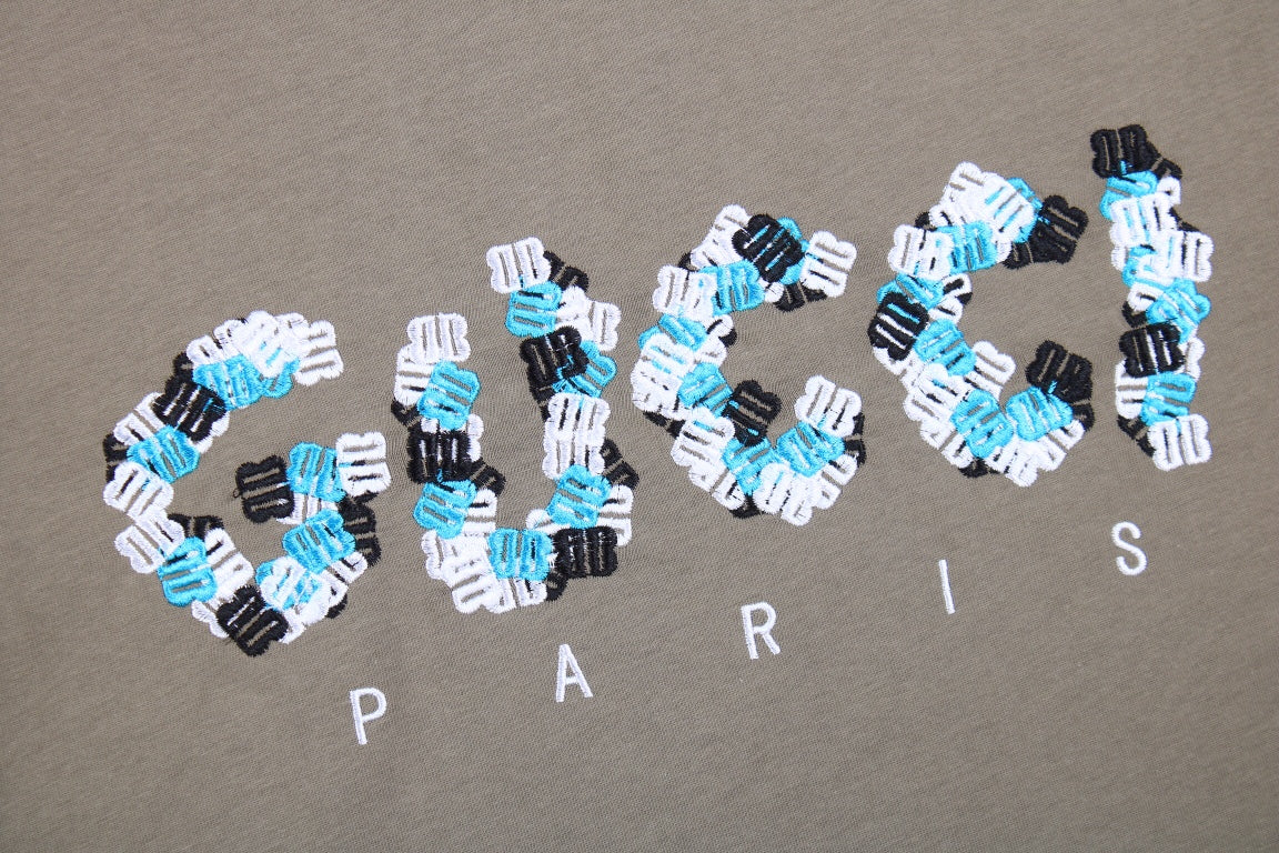 Dressed in a versatile khaki colorway, this tee features a collaborative Gucci x Balenciaga logo accented with delicate floral graphics, adding a sophisticated yet edgy touch. The ribbed crewneck and dropped shoulders enhance its modern, laid-back silhouette, making it perfect for pairing with relaxed denim, cargo pants, or layering under an oversized jacket for a refined streetwear look.