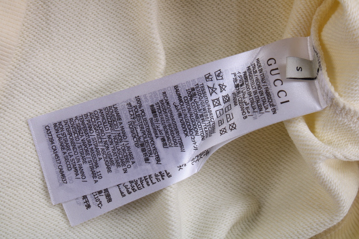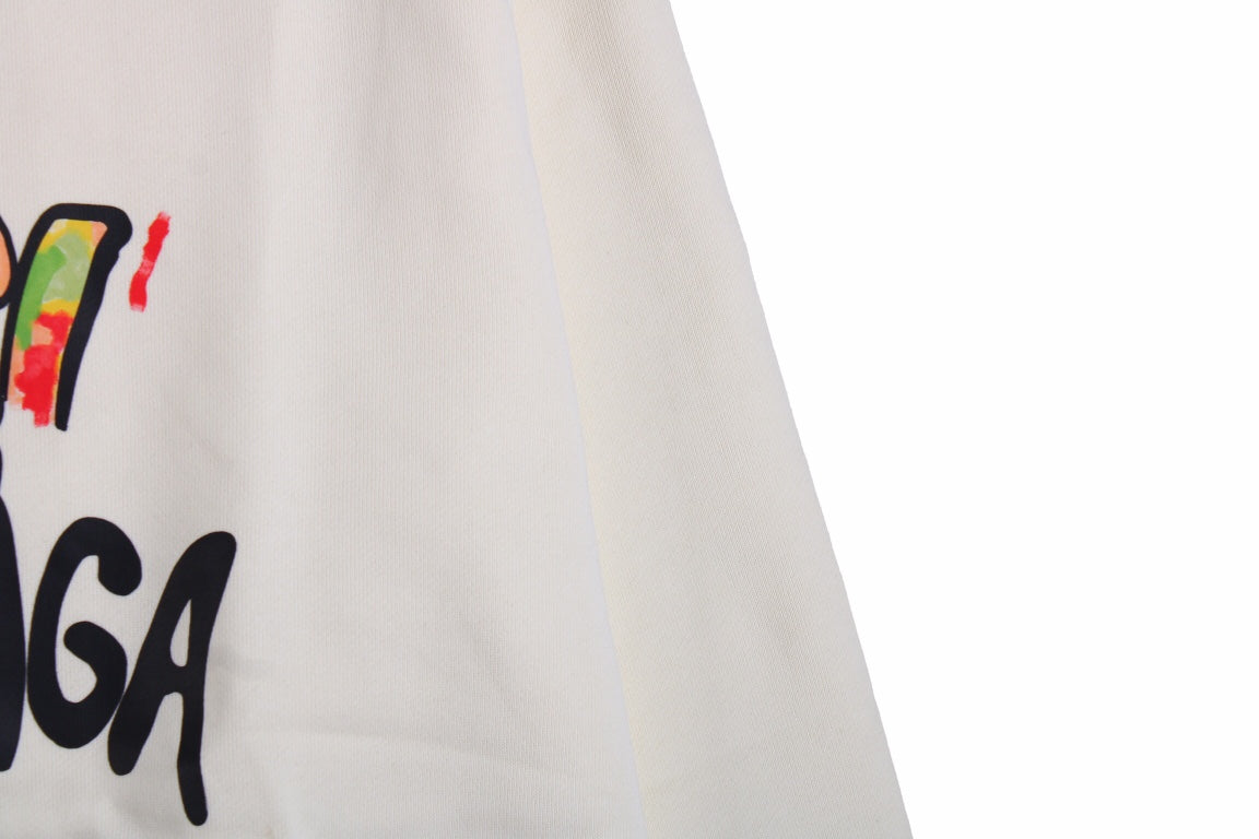 White sweatshirt featuring a playful, colorful "Gucci Balenciaga" graphic. Designed with ribbed cuffs and hem for added comfort. Perfect for a casual, stylish look