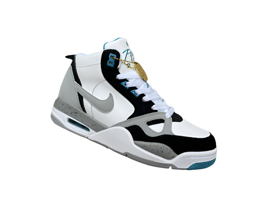 The sneaker featured in the image is the Nike Air Flight 89 'White/Cool Grey/Aquamarine,' a retro basketball shoe that combines classic design elements with a fresh colorway. The Air Flight 89 is known for its nostalgic appeal, as it closely resembles the iconic Air Jordan 4, sharing the same midsole and outsole design.