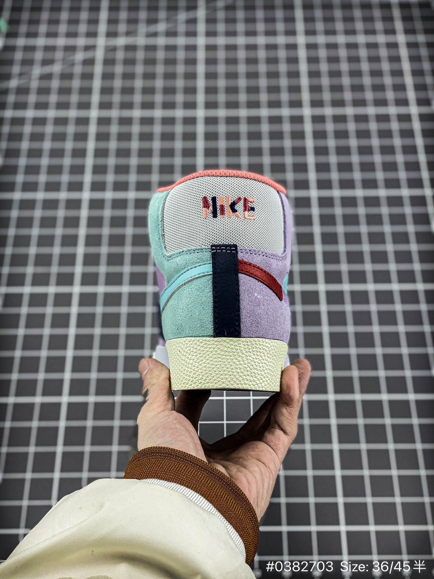 The Nike Blazer Mid PRM "Blue Mosaic" brings a fresh, artistic twist to the iconic Blazer silhouette. Featuring a vibrant blue and purple suede upper, this mid-top sneaker stands out with its unique "broken" Swoosh design, adding a deconstructed, modern edge. The mosaic-inspired detailing throughout the shoe gives it a creative and dynamic aesthetic, perfect for those who love bold, statement-making footwear. A padded collar enhances ankle support and comfort, while the classic mid-cut profile offers versatility and a snug fit. Equipped with a durable rubber outsole and a reliable herringbone traction pattern, this Blazer is designed for all-day wear. Whether you're hitting the streets or looking to elevate your casual style, the "Blue Mosaic" is a perfect blend of artistic expression and classic Nike heritage, making it a standout addition to any sneaker collection.
