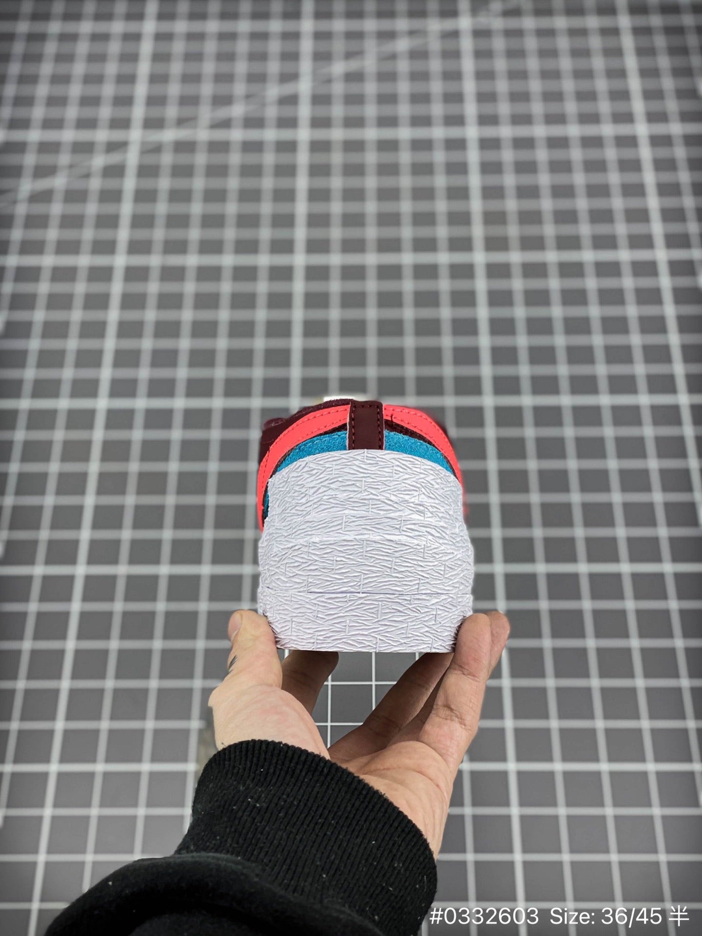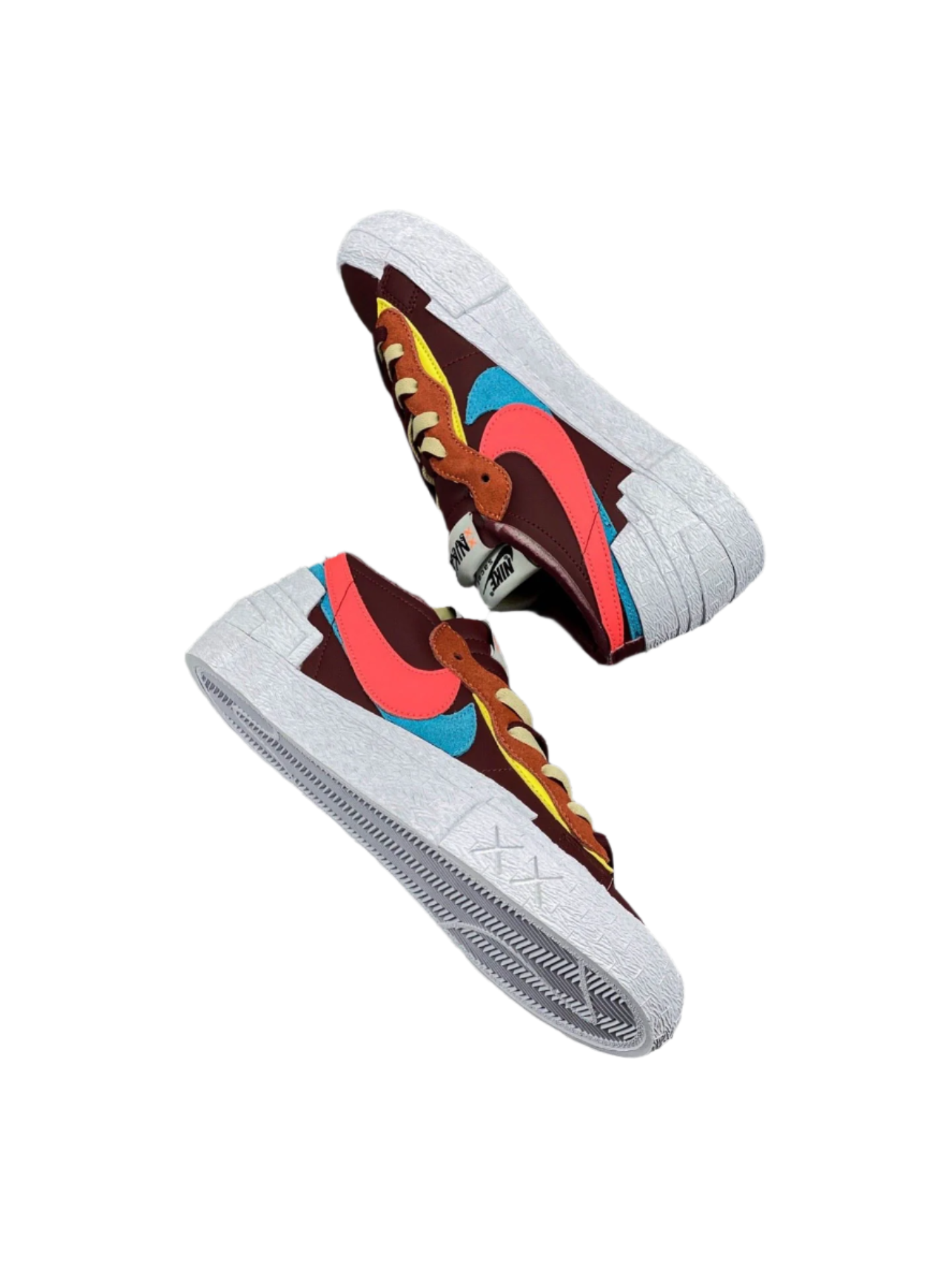 The KAWS x Nike Blazer "Team Red" delivers an artistic reinterpretation of the classic low-top silhouette with deconstructed elements and a rich, wine-red colorway. Crafted in collaboration with the renowned artist KAWS, this sneaker features a premium suede upper in deep burgundy, accented by exposed stitching and layered details that give it a raw, unfinished aesthetic. Signature KAWS "XX" branding is subtly integrated, adding a touch of exclusivity and creativity to the design. The deconstructed tongue and mismatched paneling further enhance the sneaker’s avant-garde vibe. A low-profile design ensures comfort and versatility, while the durable rubber outsole with a herringbone tread provides reliable grip and stability. Perfect for those who appreciate art-inspired footwear and bold design choices, the KAWS x Nike Blazer "Team Red" is a standout piece that effortlessly blends heritage with modern artistic flair.