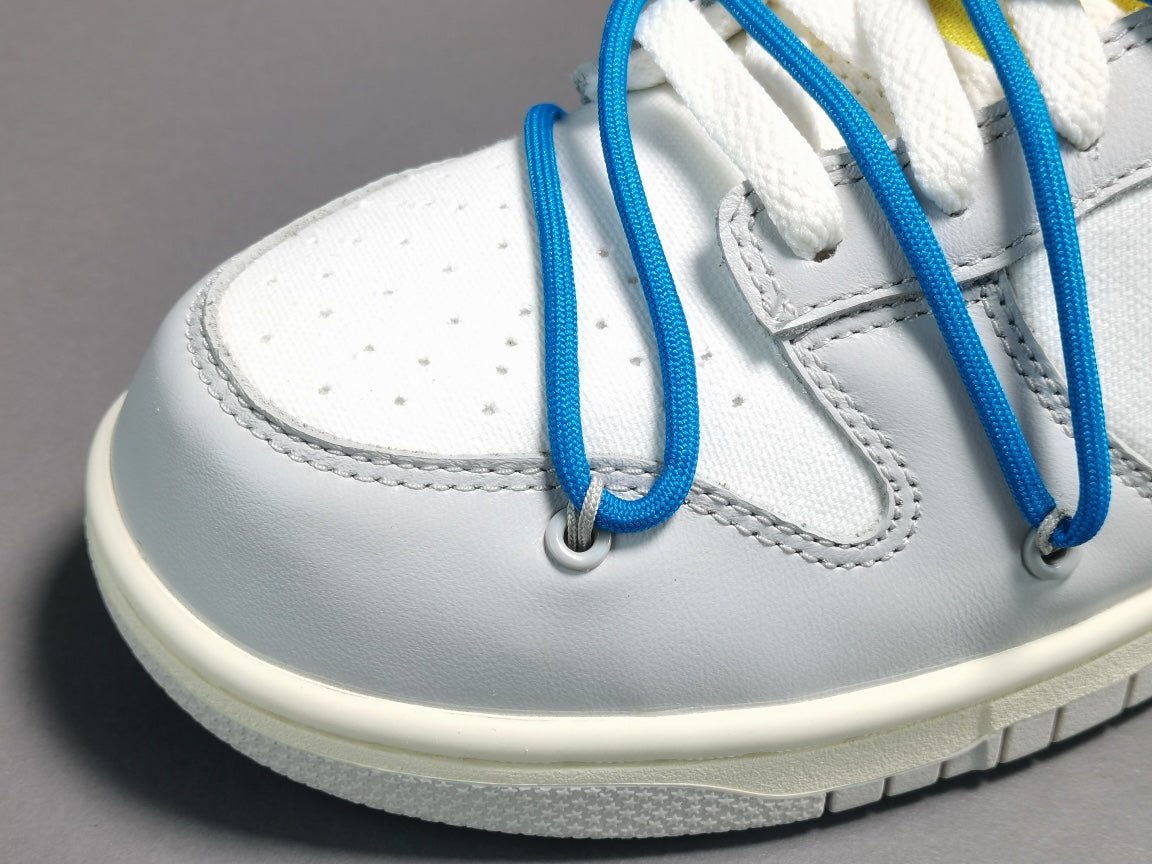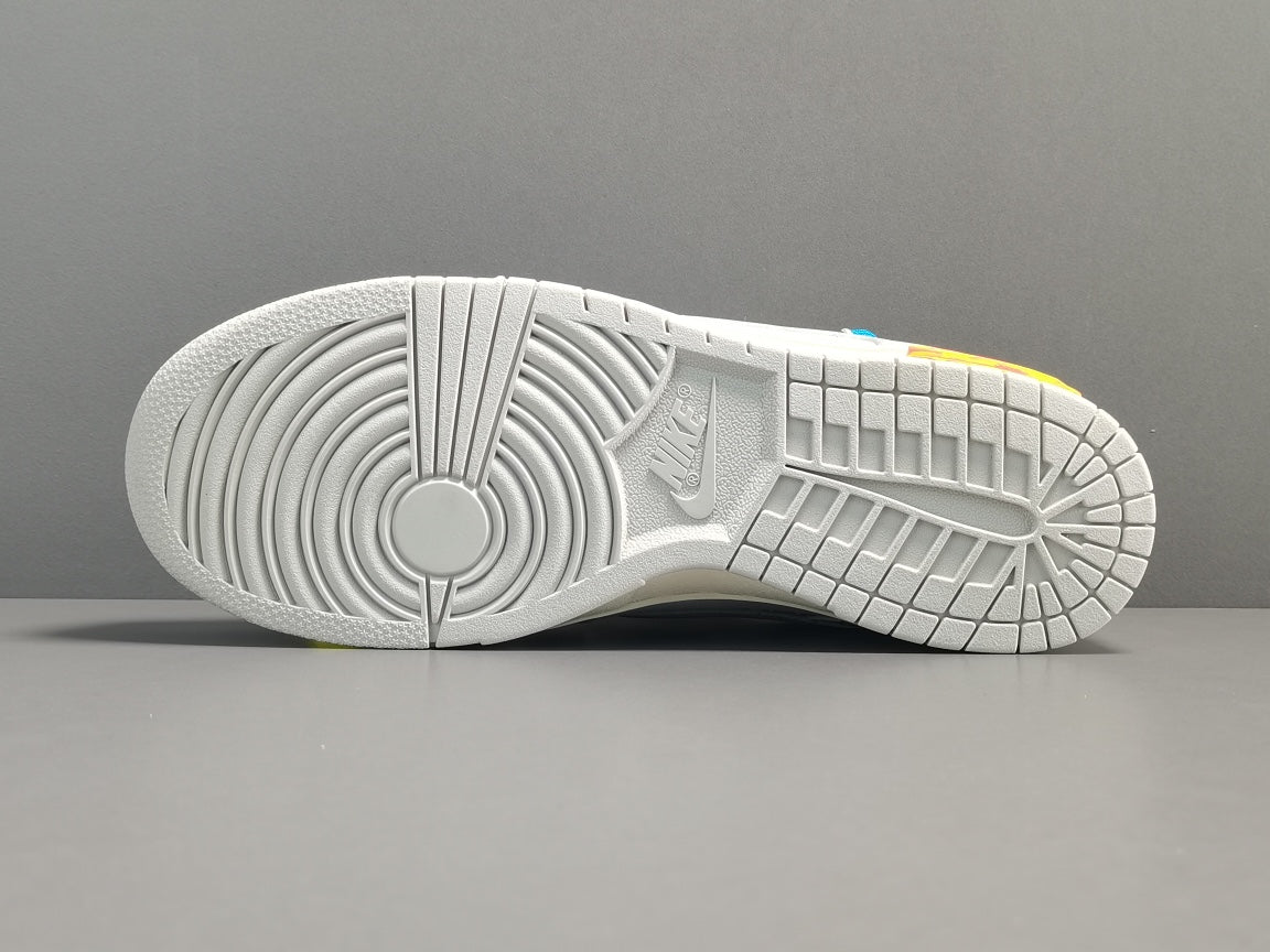 The Nike Dunk x Off-White Lot 10 sneakers feature a distinct blend of materials, textures, and colors, creating a visually striking and unconventional aesthetic. With Off-White's characteristic deconstructed design elements, including exposed foam, stitching details, and text overlays, these sneakers push the boundaries of sneaker design and streetwear fashion.