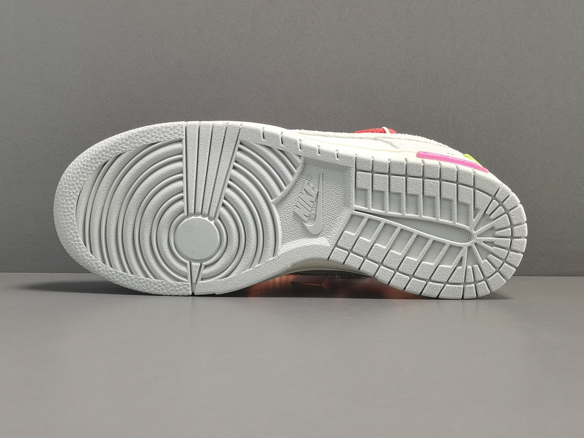 The Nike Dunk x Off-White Lot 40 sneakers showcase a captivating blend of materials, textures, and colors, resulting in a visually striking and unconventional aesthetic. With Off-White's signature deconstructed design elements, including exposed foam, stitching details, and text overlays, these sneakers embody a fearless and innovative style that sets them apart.