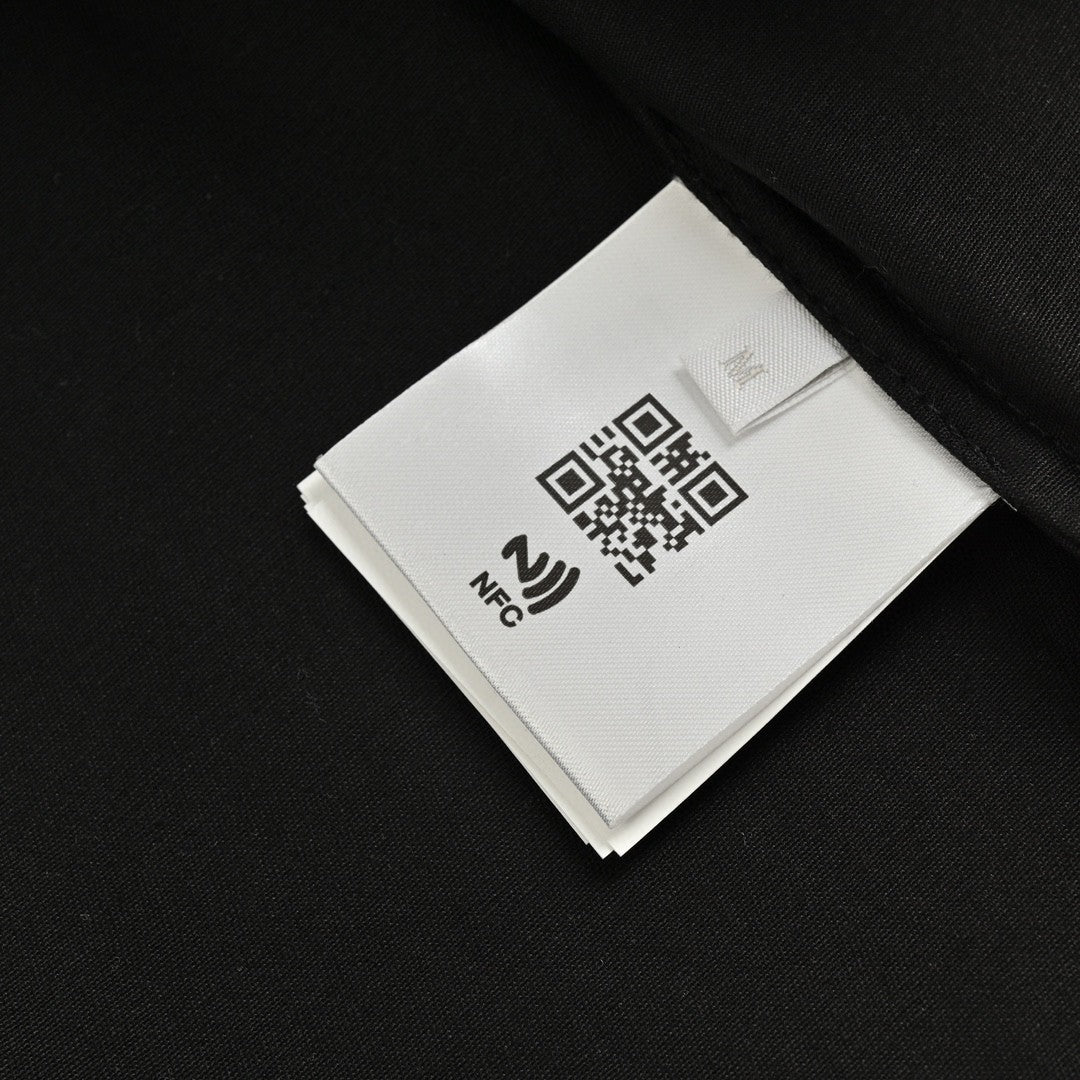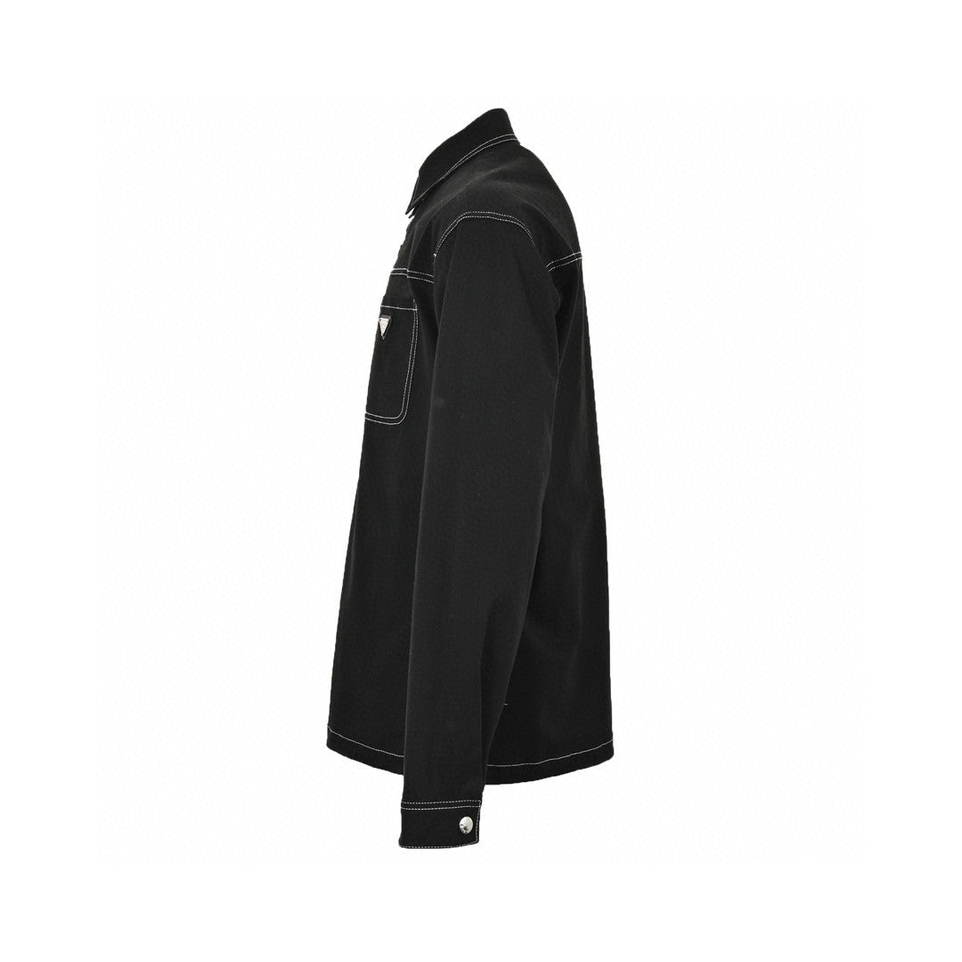 This Prada shirt features a classic black design with contrast white stitching. It has a button-up front and a chest pocket adorned with the iconic Prada triangle logo. The long sleeves and tailored fit make it perfect for a sophisticated and modern look. Ideal for both casual and formal occasions.