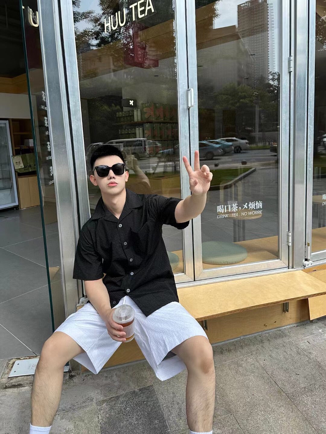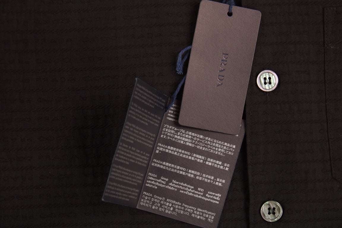 Black short-sleeve button-up shirt with a subtle checkered pattern. Features a front pocket and classic collar. Designed for a sleek and minimalist style.